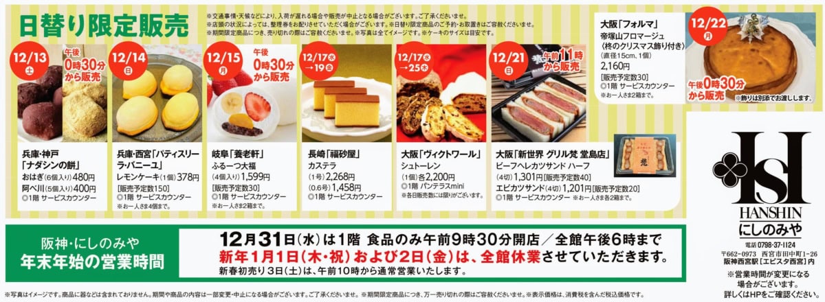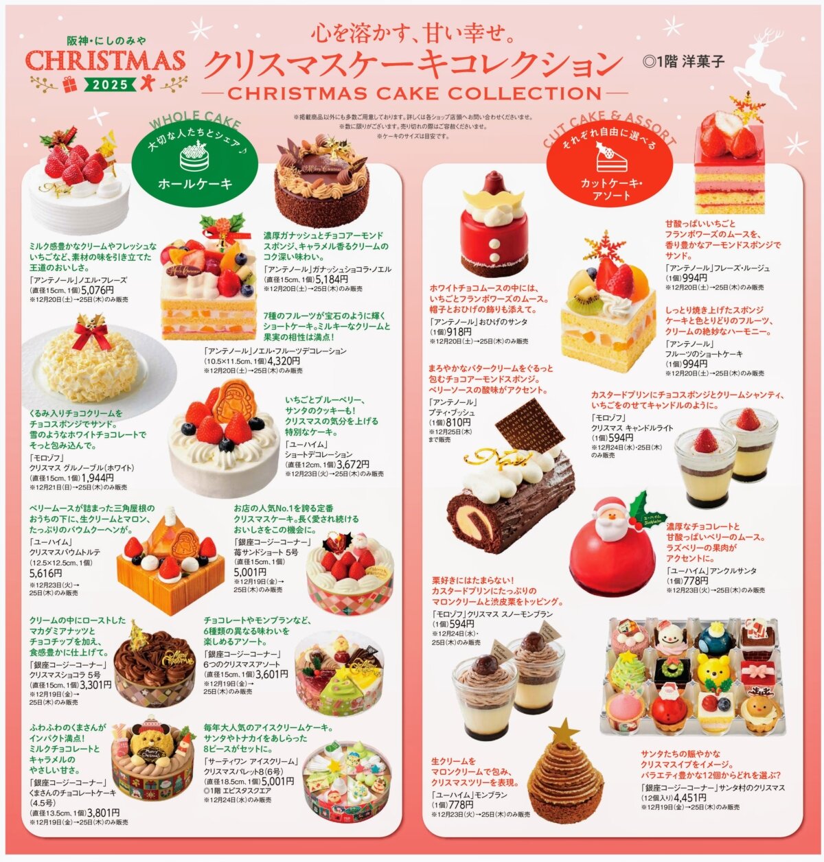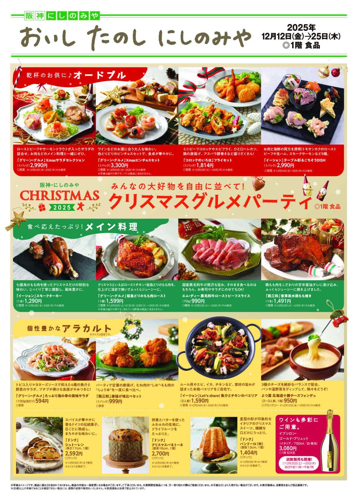 クリスマス用のオードブル・メイン・アラカルト各種は阪神・にしのみや1階食品売場で販売予定です。商品によって販売期間が違うので、上のチラシをよくチェックしてくださいね
