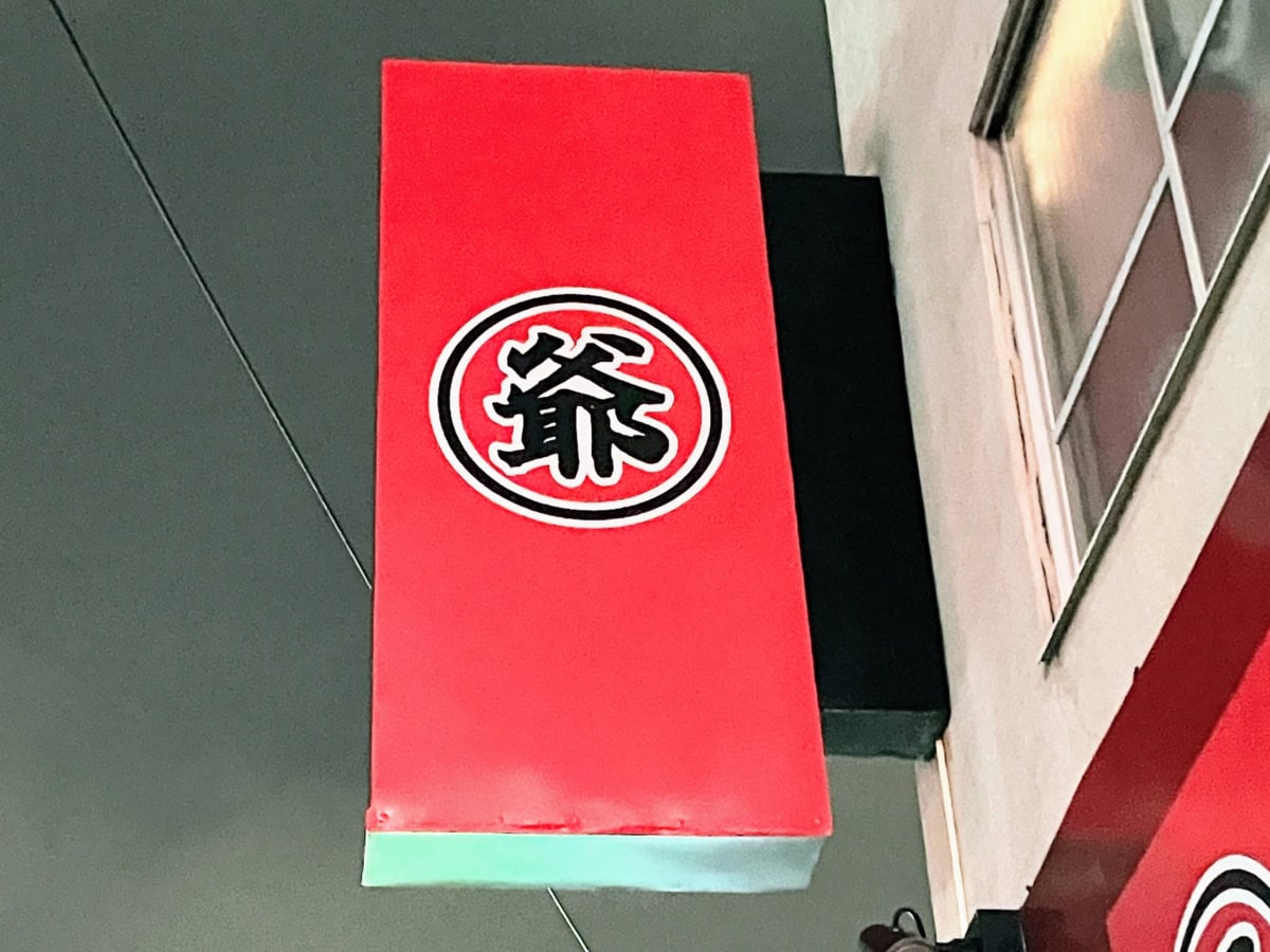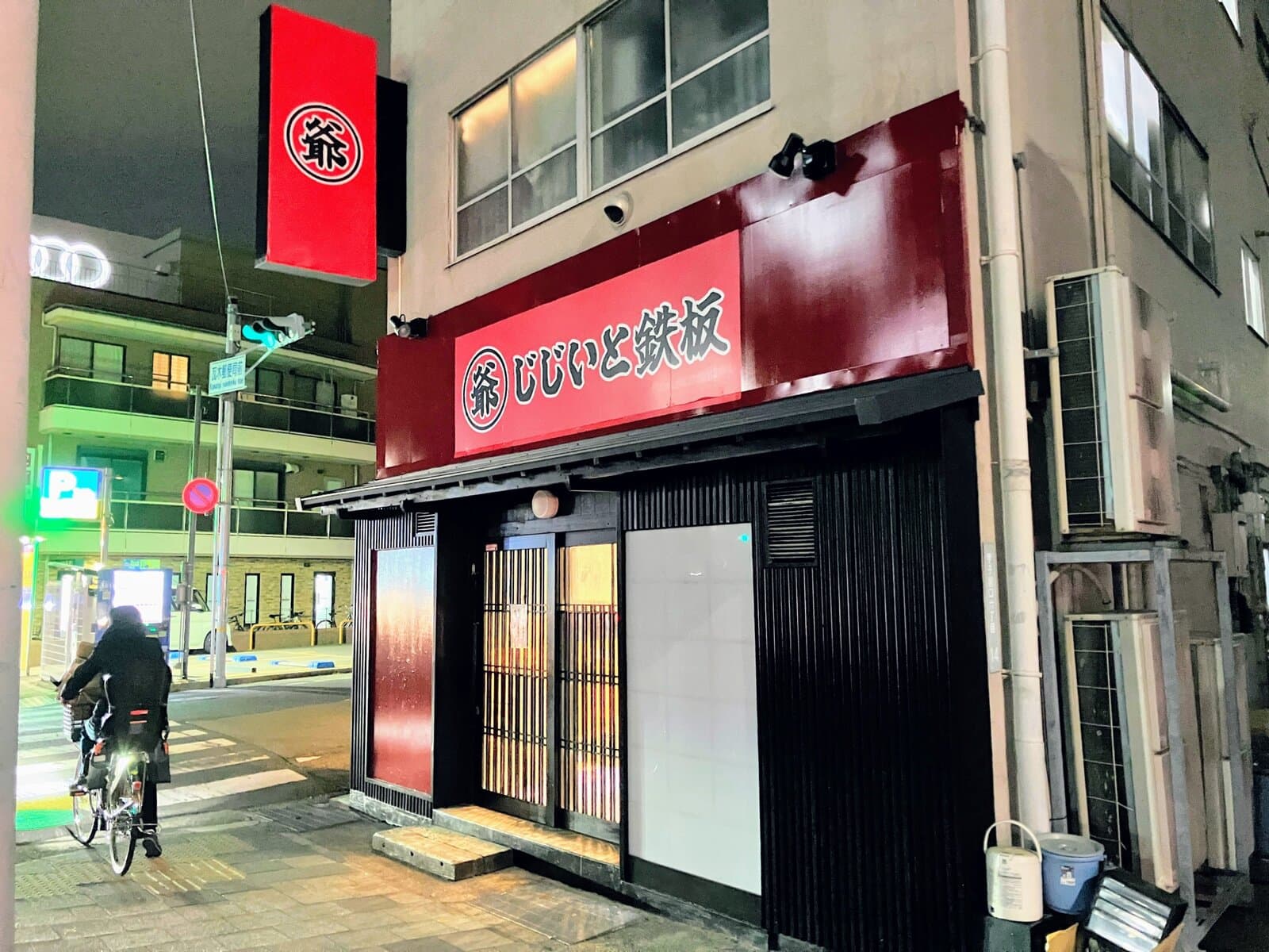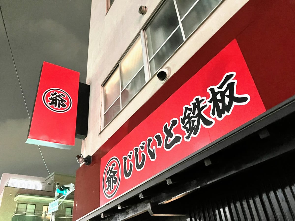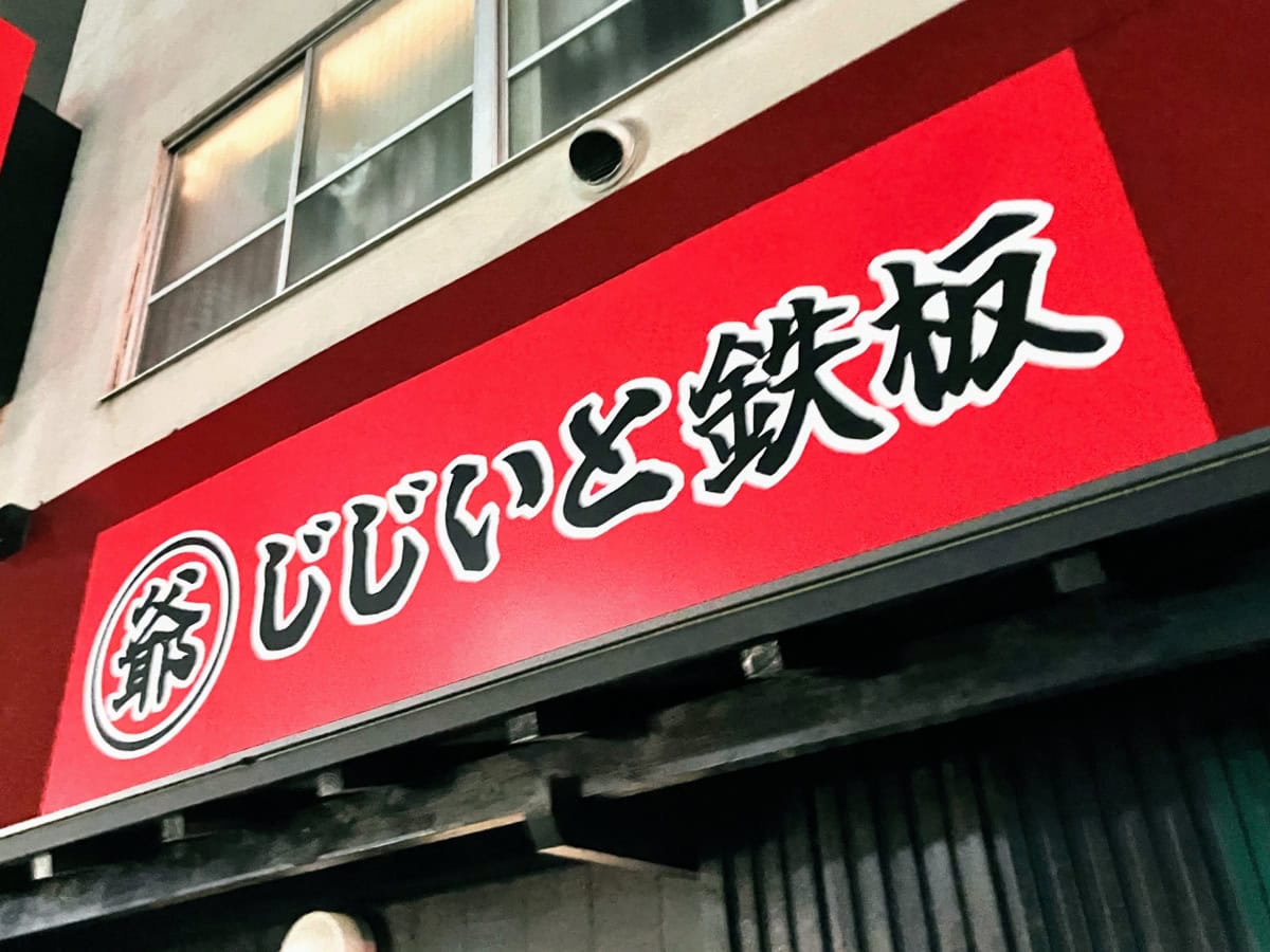 真っ赤な外観にドーンと大きく「じじいと鉄板」。めっちゃ目立つ〜