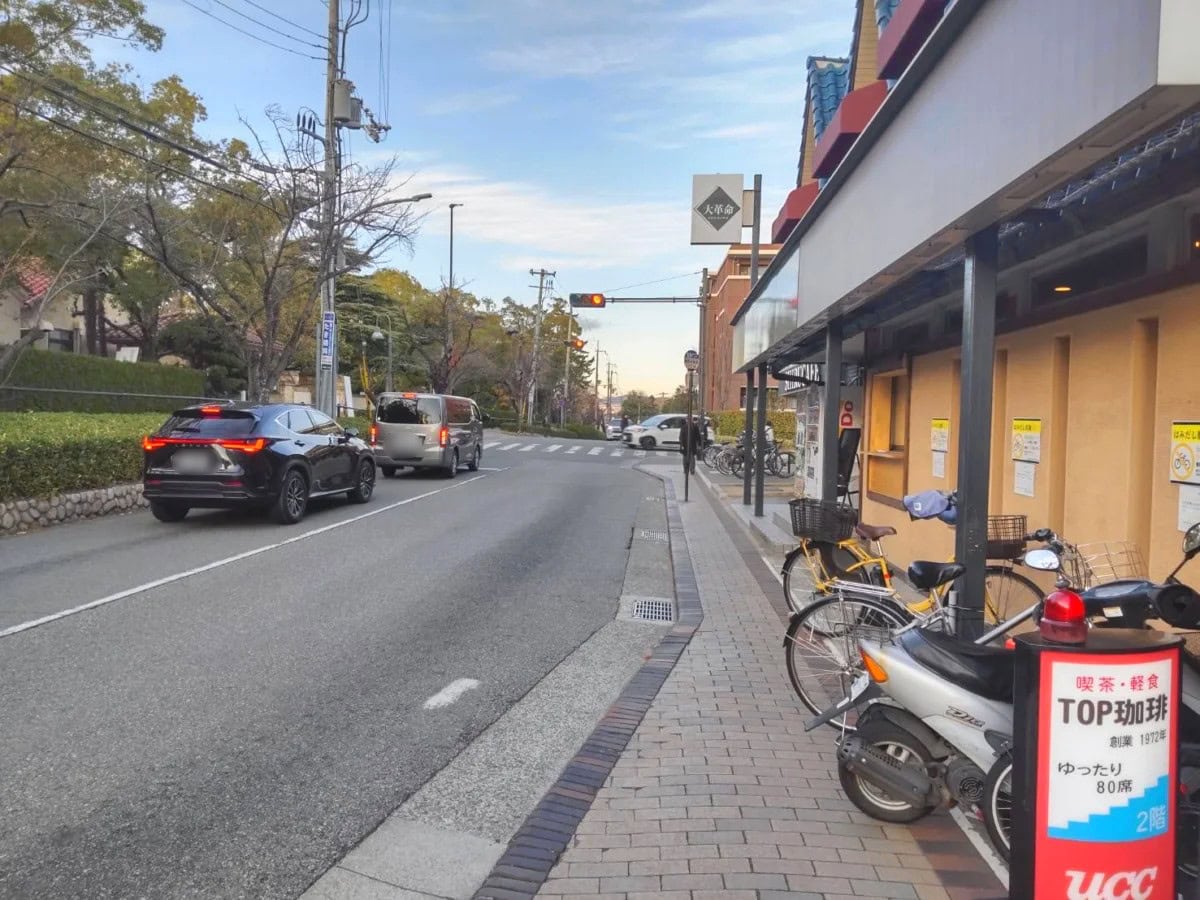 反対方向に行くと、油そば大革命、SHIRU CAFEなどがあり、花学園通りへ。関学の正面玄関です。