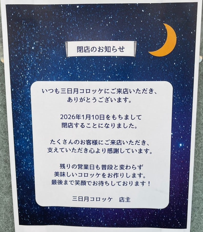 三日月コロッケさんは、過去ににしつーYouTubeのプレゼント企画にもご協力いただいたお店で、個人的にも何度もお世話になっていました〜。あの美味しいコロッケが食べられなくなると思うと、本当に残念です😢来年1/10までは営業されているので、気になる方はぜひそれまでに味わってみてくださいね。