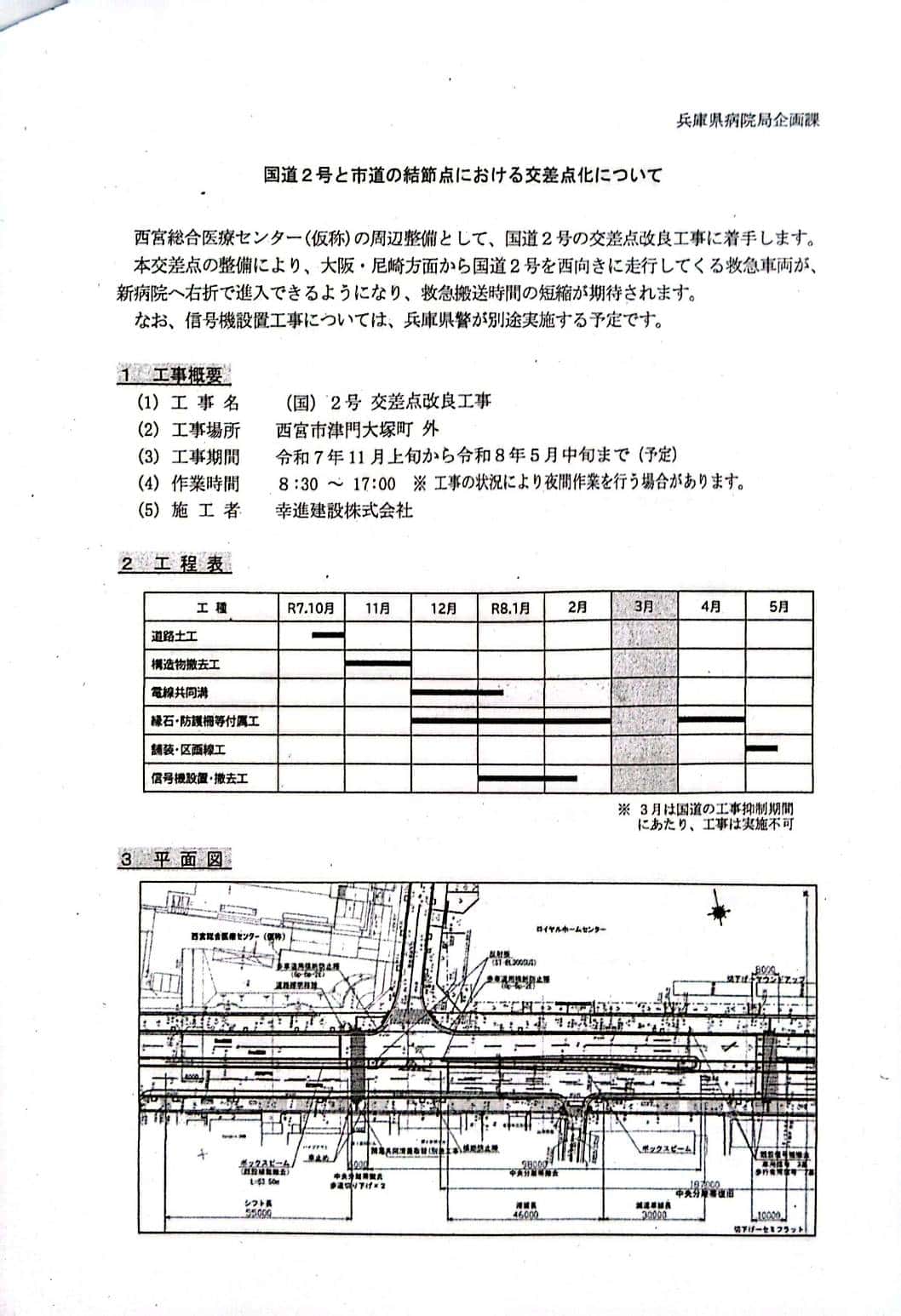 大阪・尼崎方面から国道2号を西向き(神戸方面)に行く車線から新病院へ右折ができるようになるので、 救急搬送時間の短縮が期待されるとのこと!