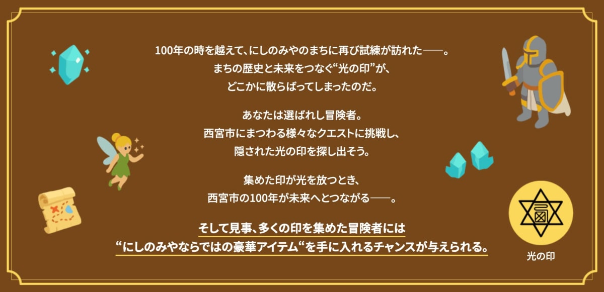 - あいことば探し・スポットめぐり・場所クイズなどの、西宮にまつわるクエストに挑戦🗺️