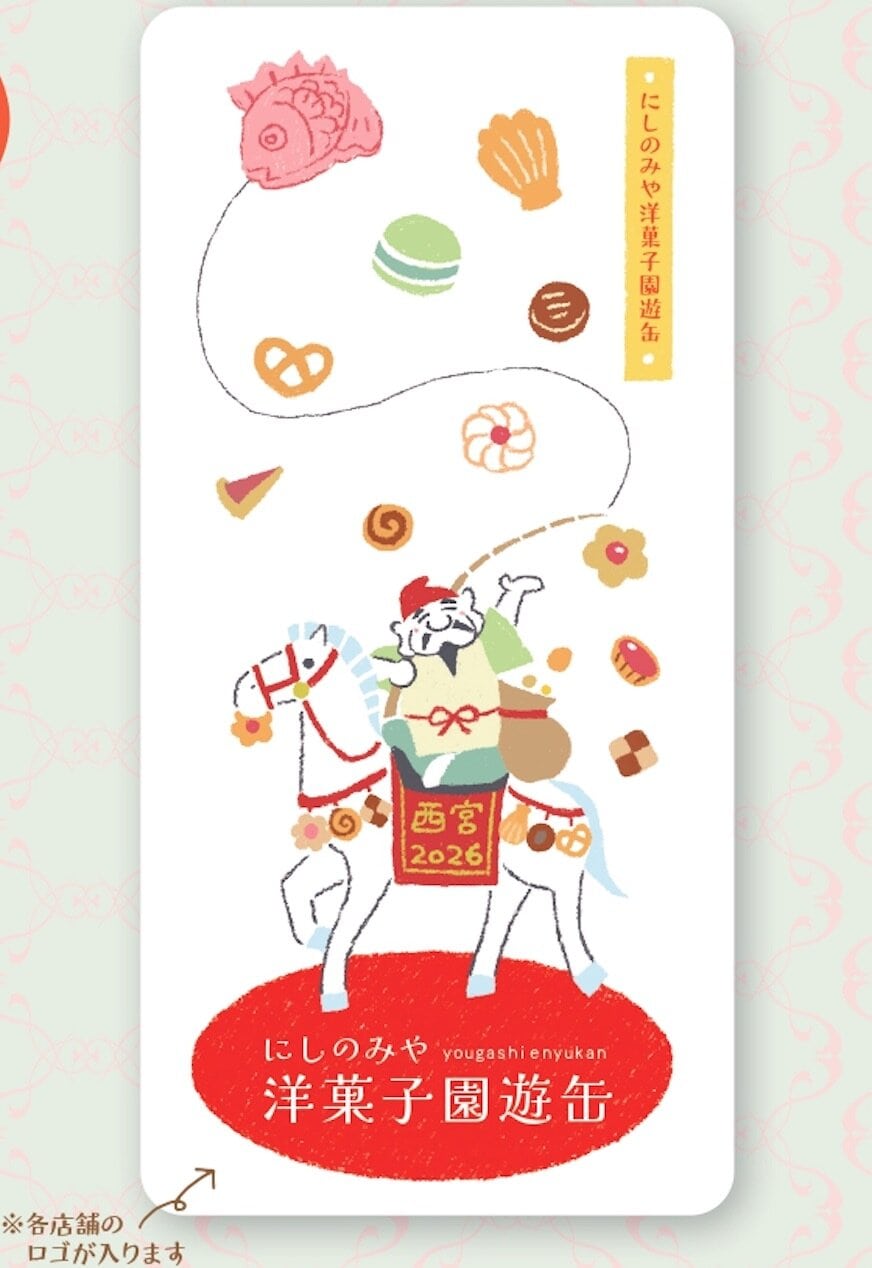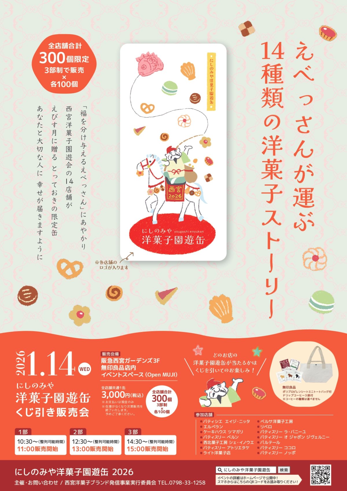 - 西宮の人気洋菓子店14店舗の焼き菓子が入った福缶を販売🎁2026年の干支「午」とえびす様デザインの限定缶で、どのお店の缶が当たるかは、くじ引きでお楽しみ🎯