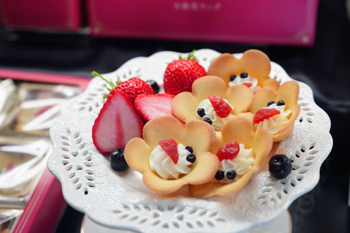 大阪花ラング。ふわふわのクリームと、ドライストロベリーとドライブルーベリーをトッピング。大阪産の蜂蜜を使用した革新的なお菓子。