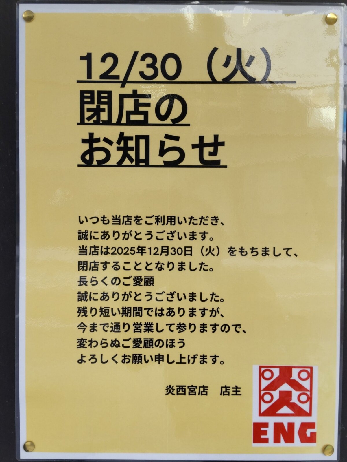 鳴尾御影線沿い戸田町の「旨辛食堂 炎」が閉店するようです。