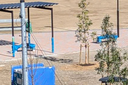 奥の青いベンチ二つが災害時に『かまど』として利用できるベンチらしい。青いシートに包み込まれてんでしょうか。謎。
