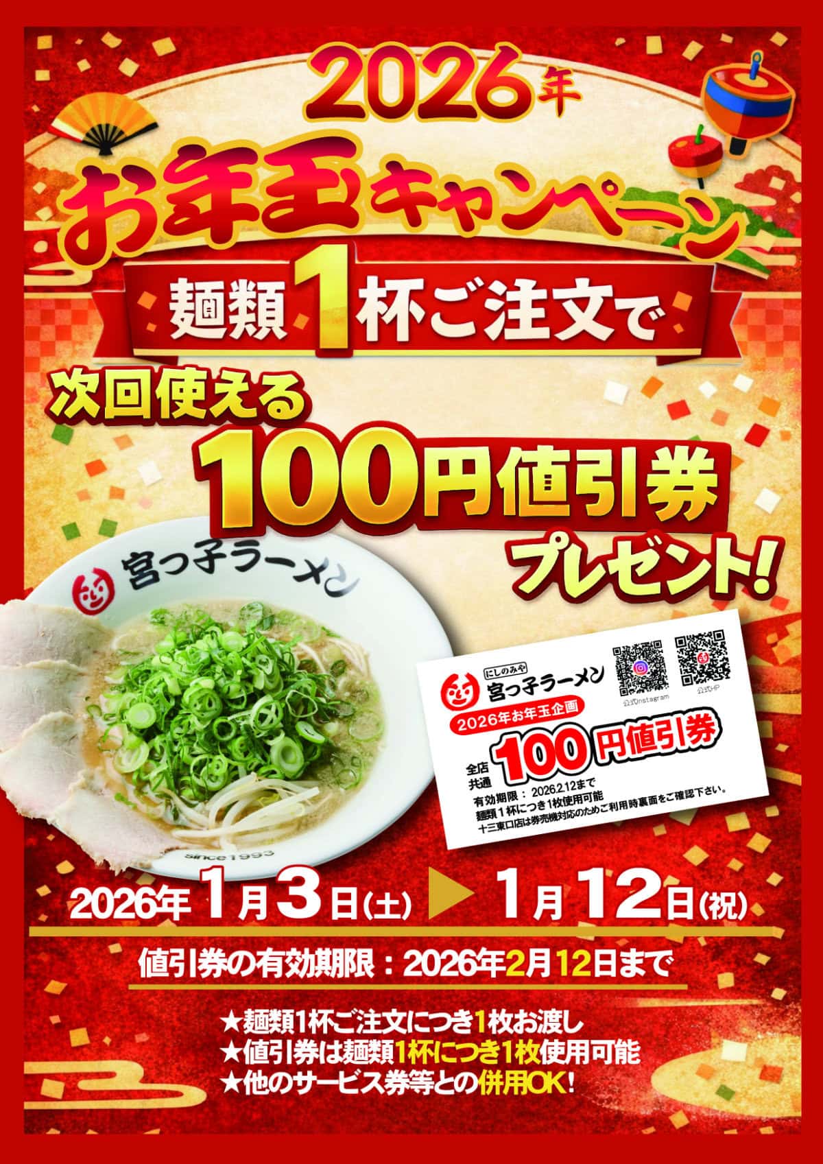 宮っ子ラーメン全店で「お年玉キャンペーン」が開催されるようです🎍