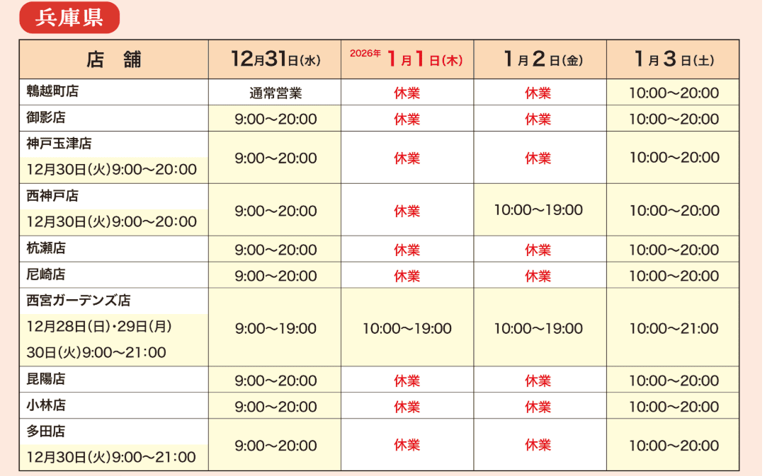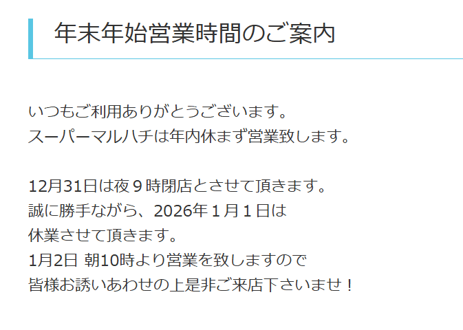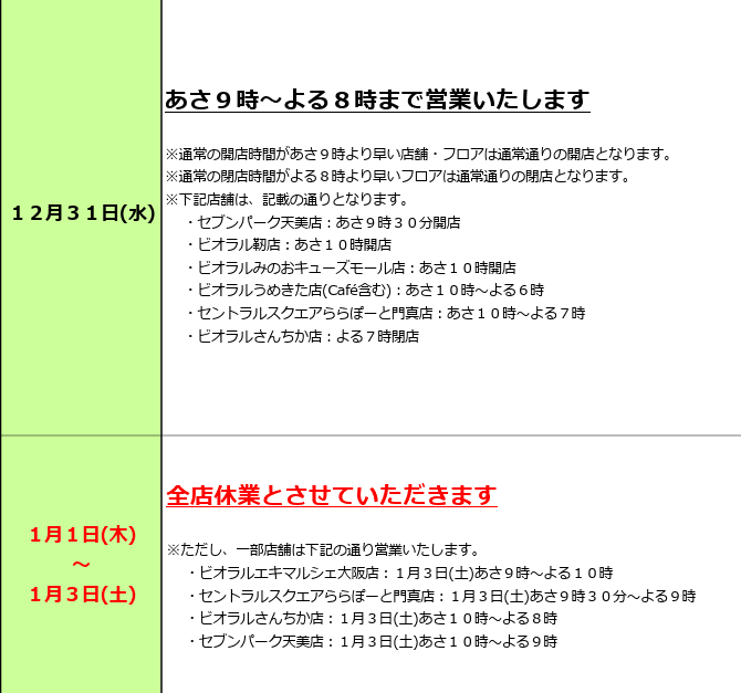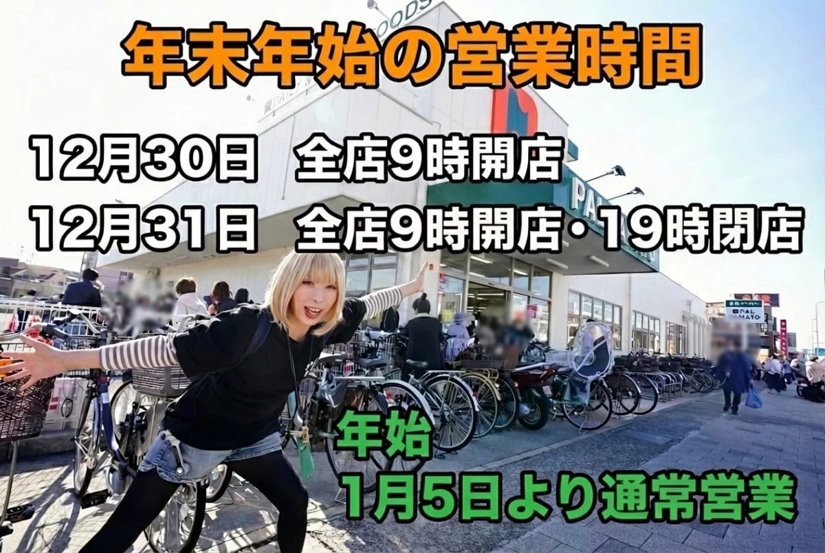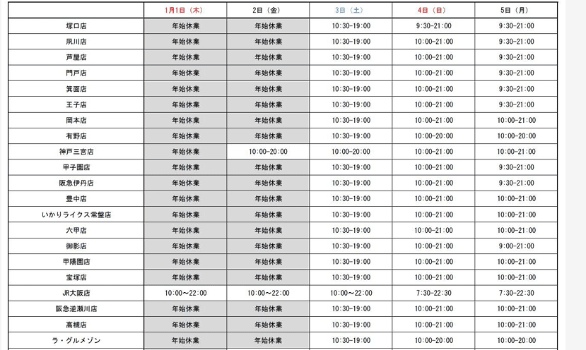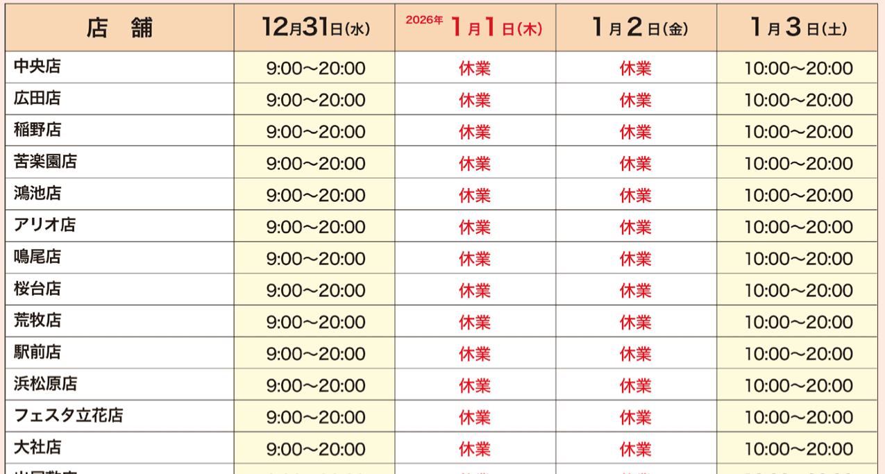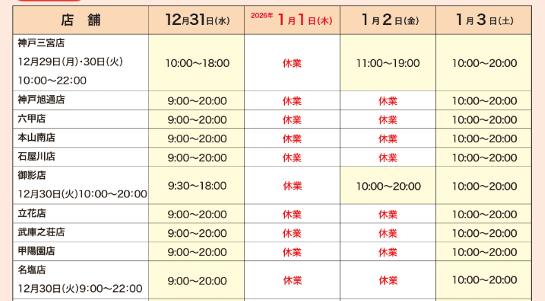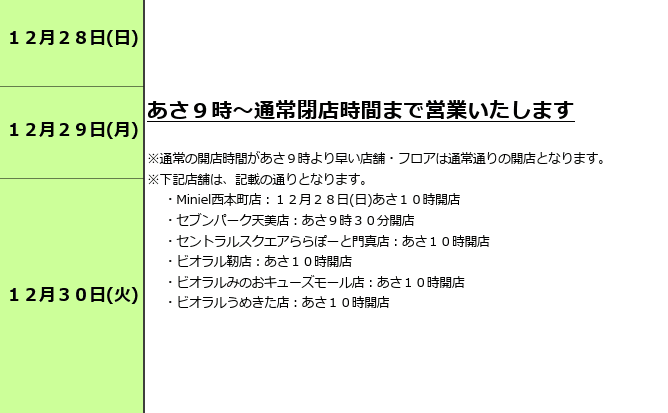 12月30日は全店9時開店、12月31日は全店9時開店19時閉店いたします。年始は1月5日より通常営業