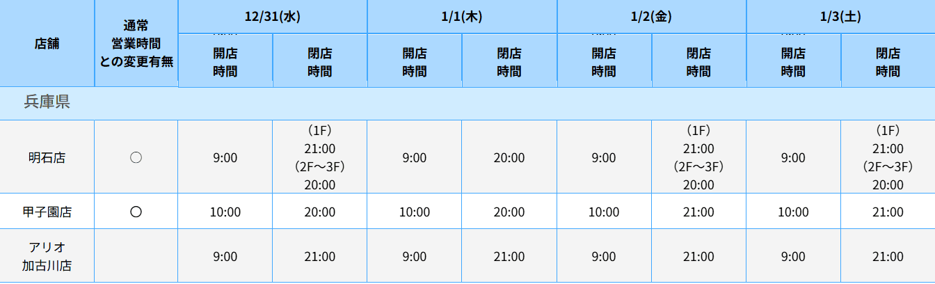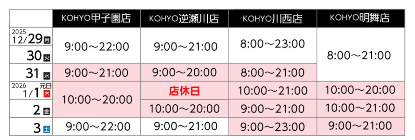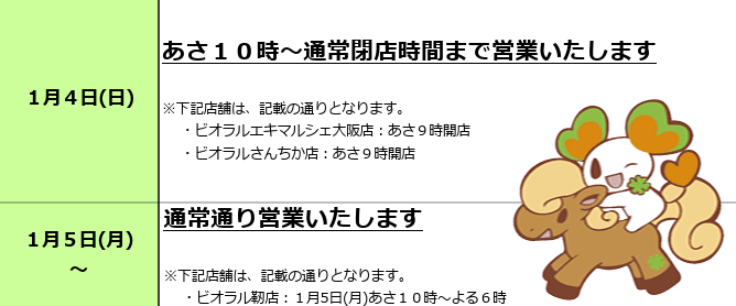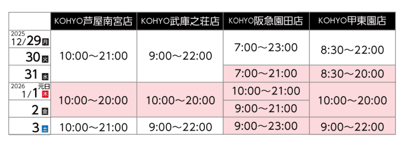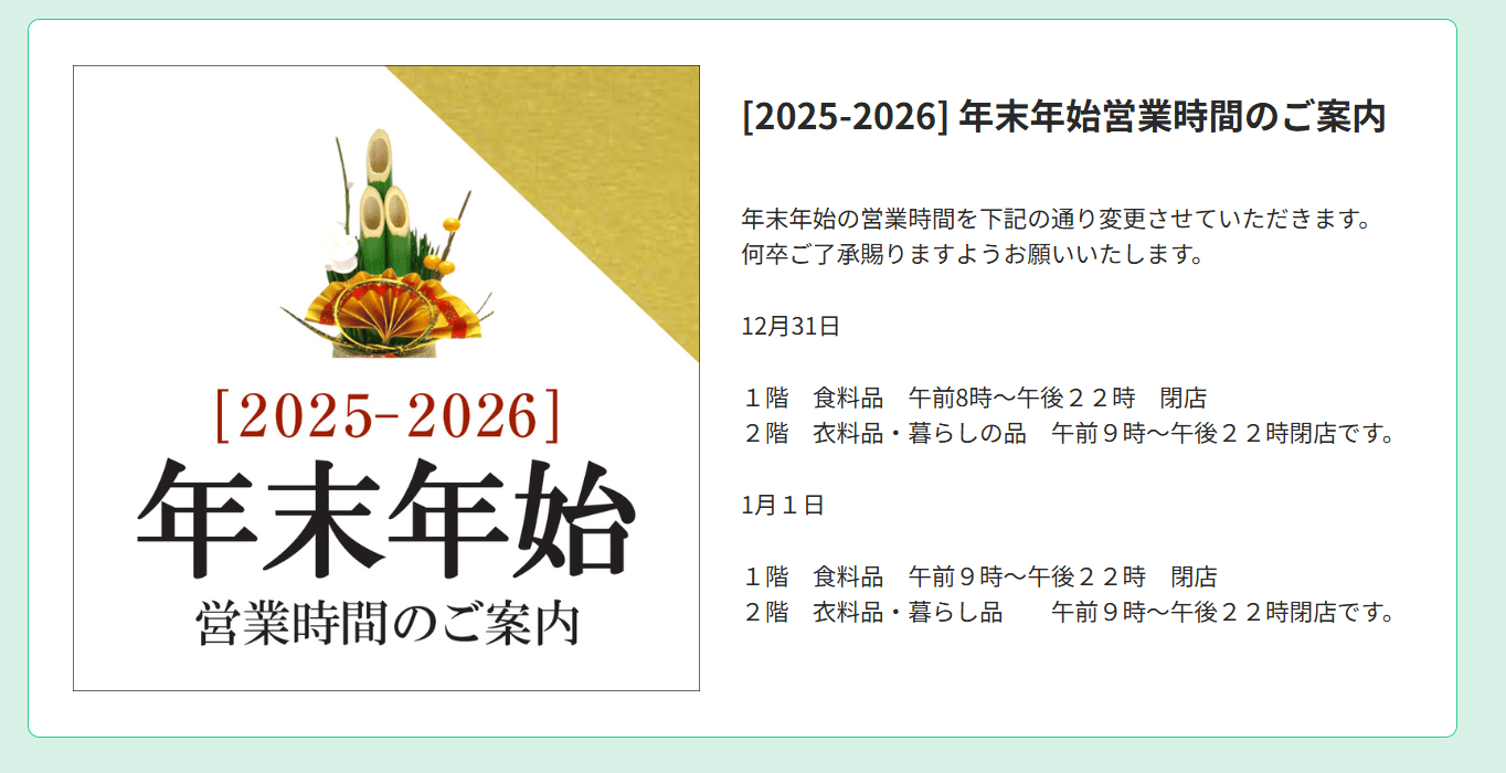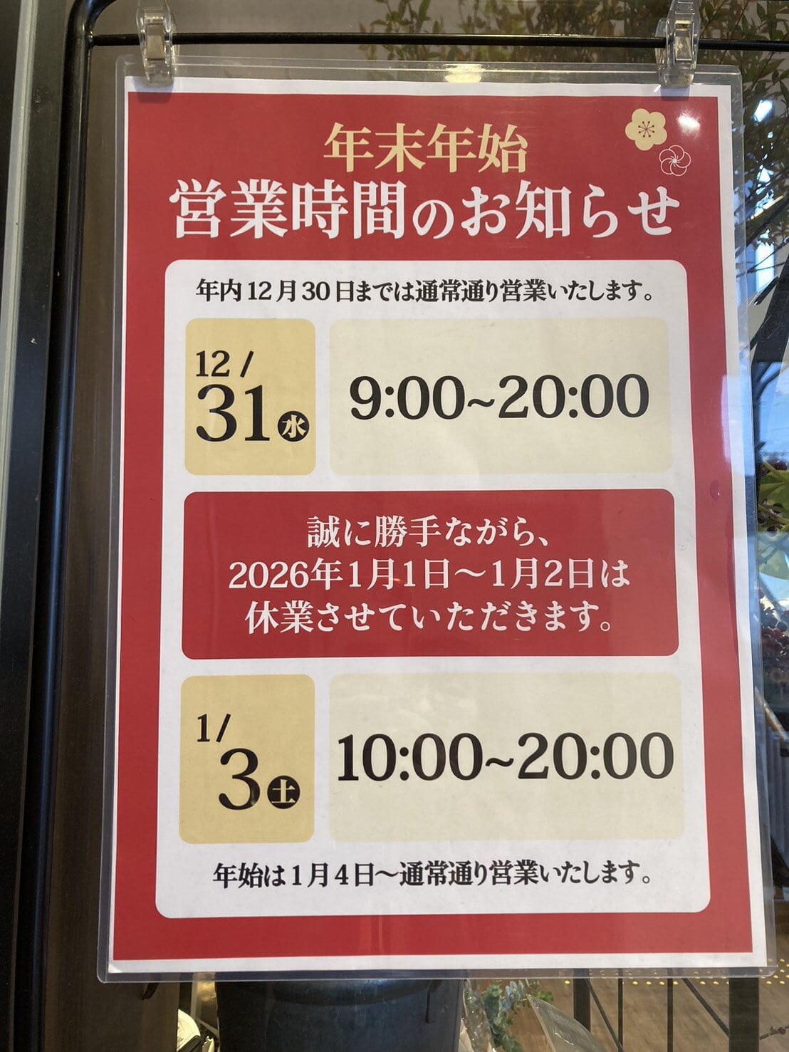 12月30日は全店9時開店、12月31日は全店9時開店19時閉店いたします。年始は1月5日より通常営業