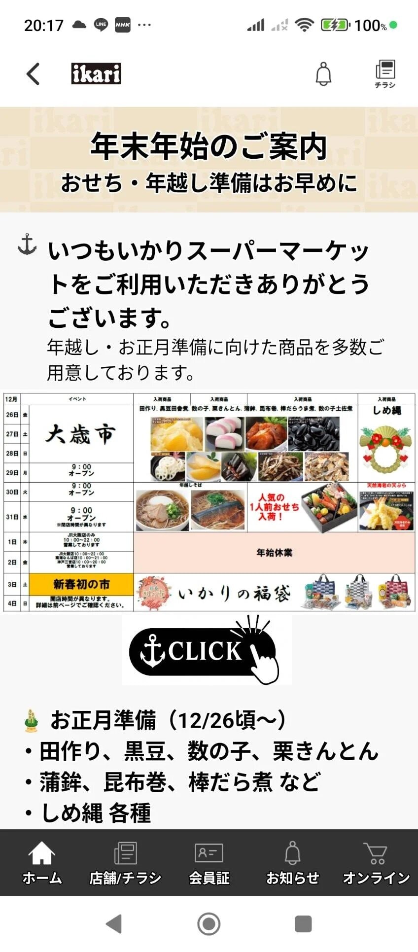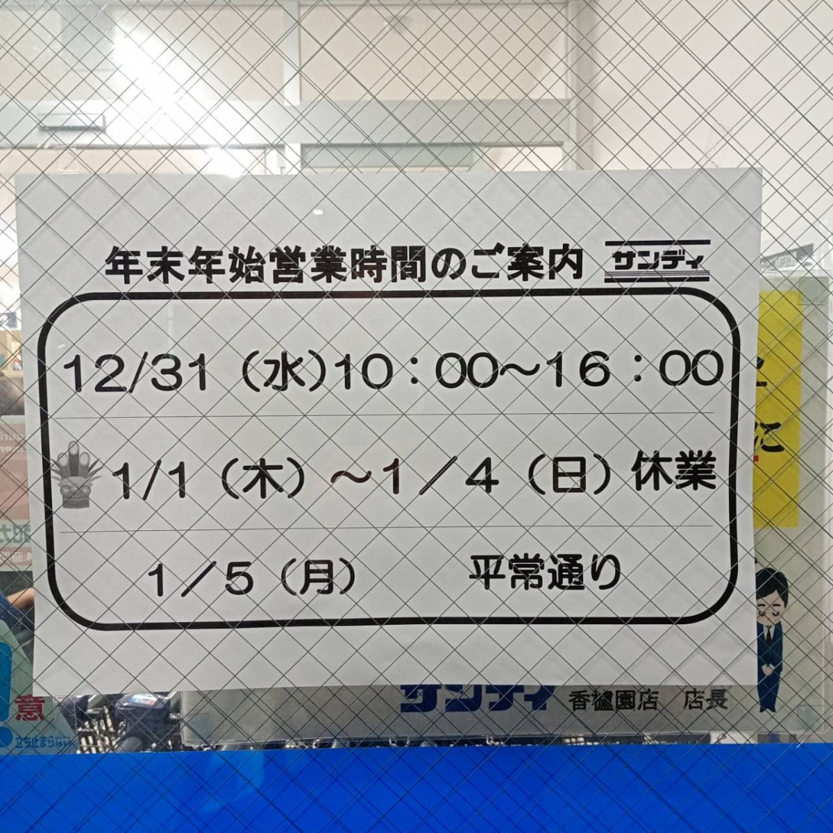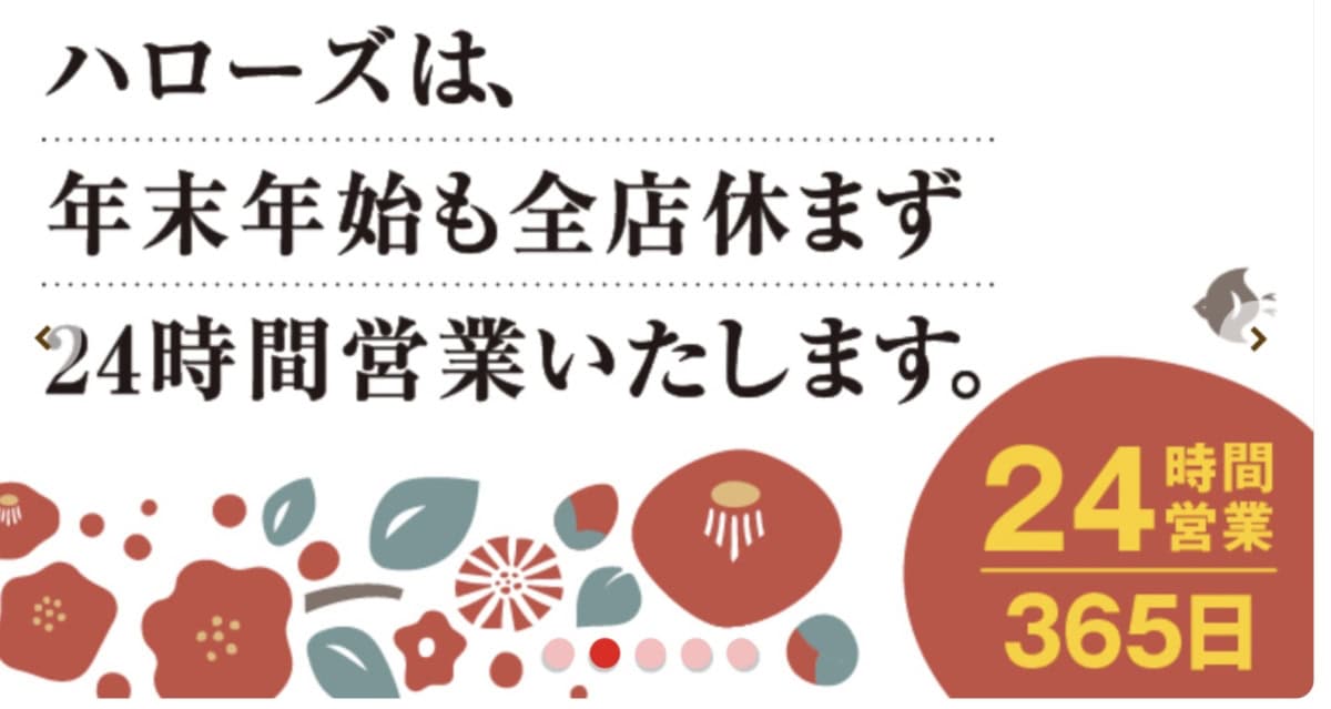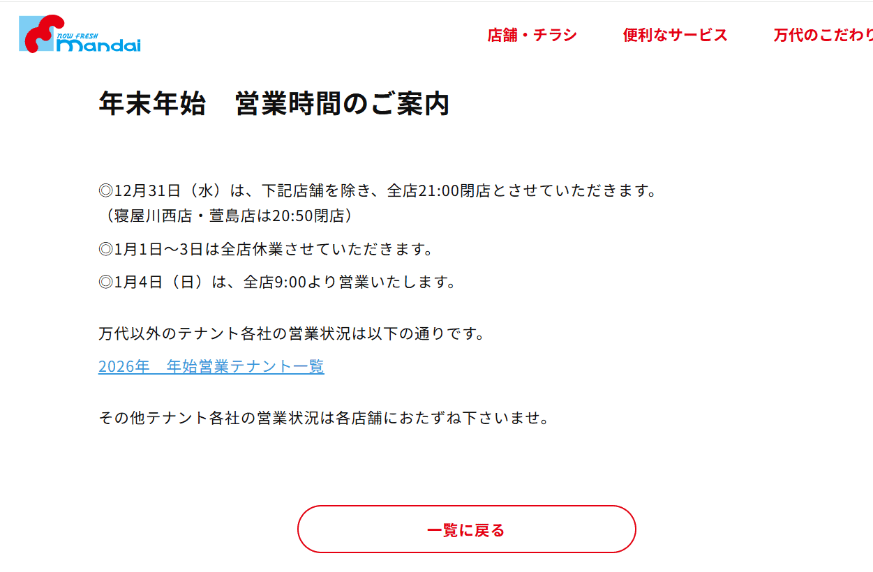 12月30日は全店9時開店、12月31日は全店9時開店19時閉店いたします。年始は1月5日より通常営業