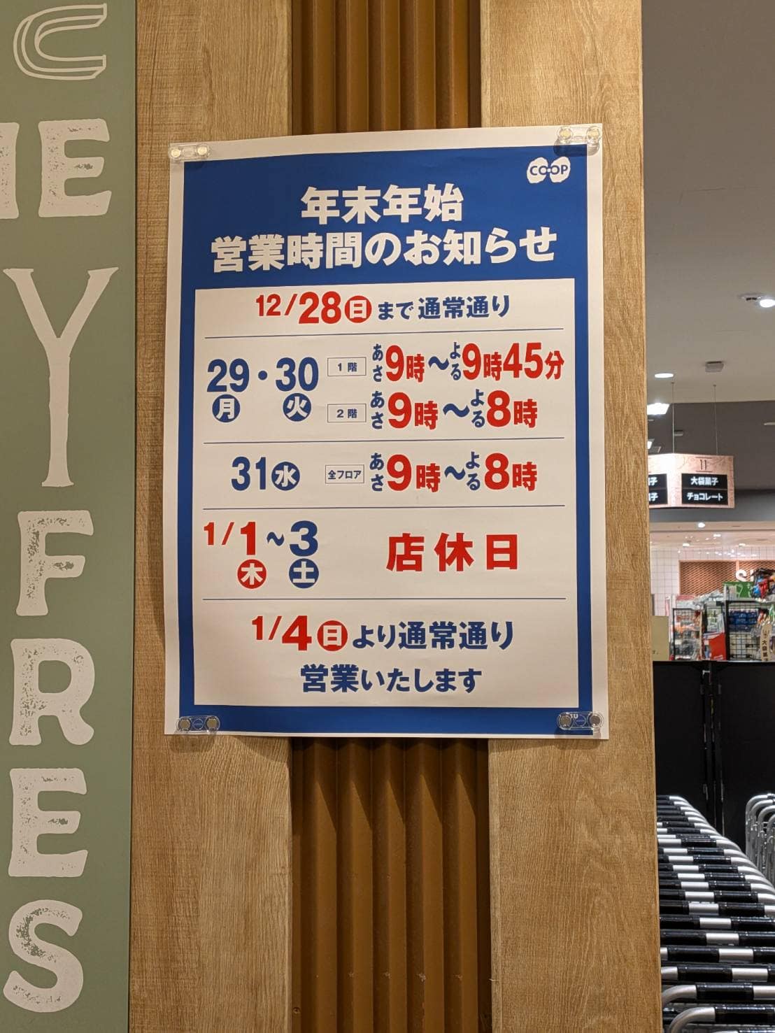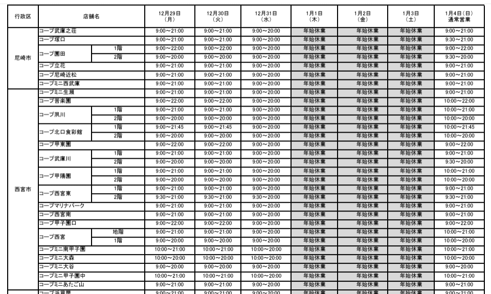お正月はしっかり休みと覚えておく感じ。コープ甲陽店も同じポスターなので全店同じものが貼れてると思います。