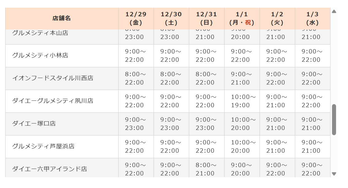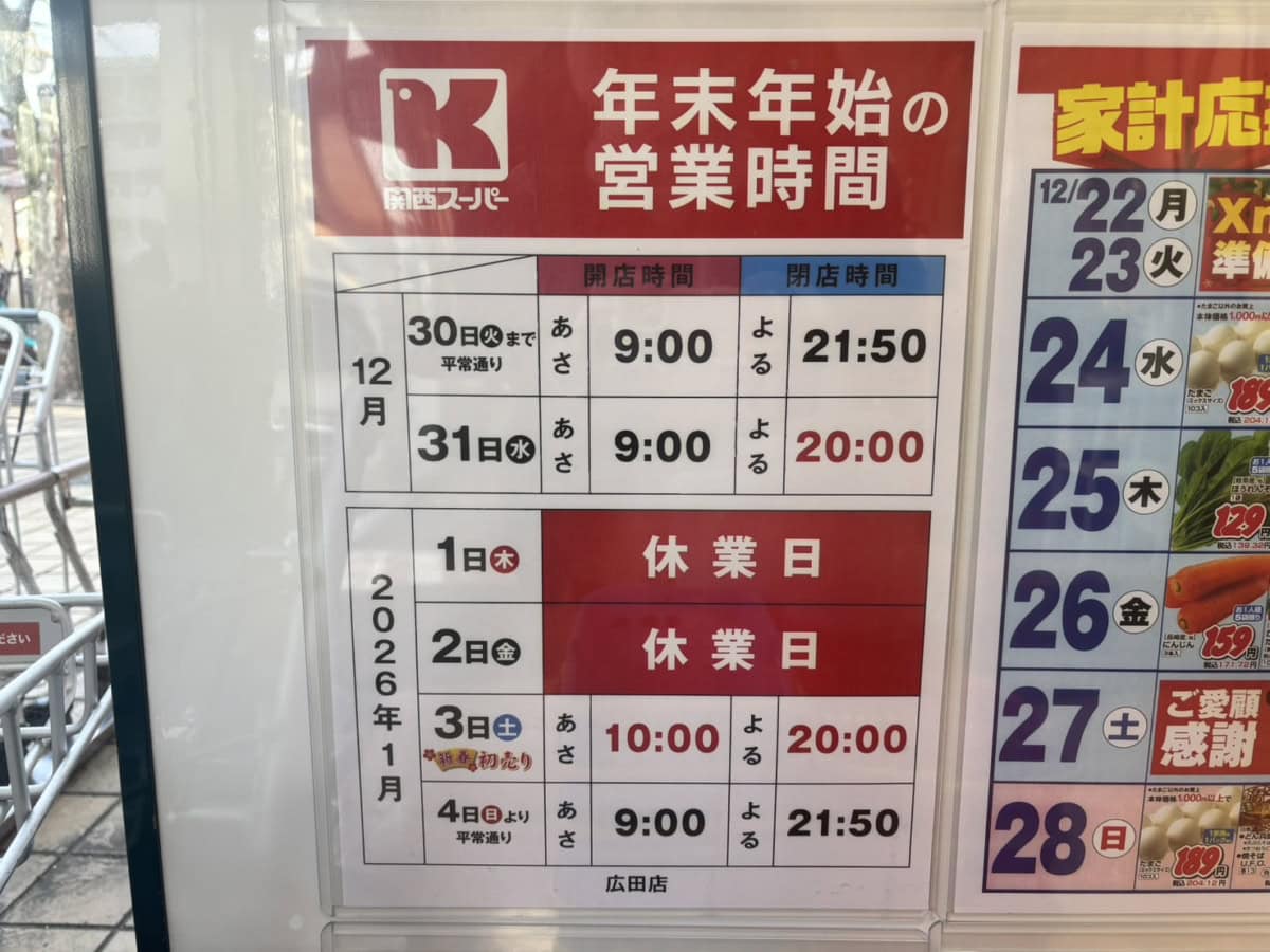 西宮市ほぼ全てのスーパーマーケットの年末年始の営業時間をまとめました。