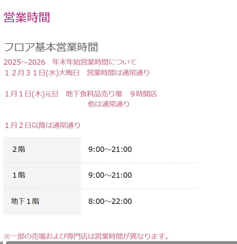 年末年始になりますが、31日と1日は営業時間が若干変更になっているようです。