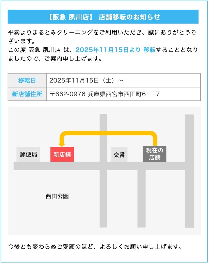 普段から、まるとみクリーニング夙川店を利用されている方は、場所が少し変わってるのでご注意くださいね〜
