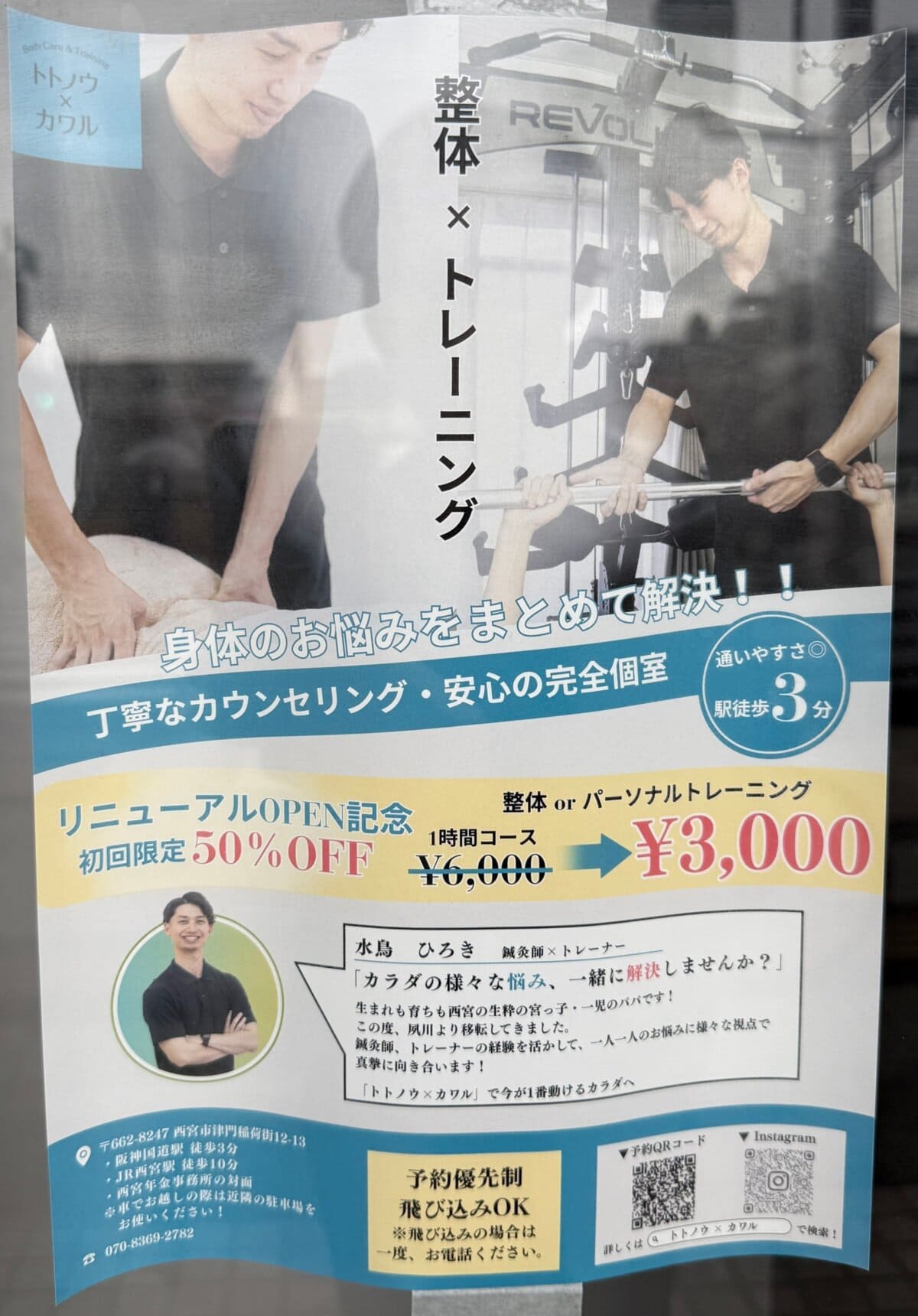 鍼灸整骨院・整形外科・高齢者施設・フィットネスジムでの経験がある先生のもとで、自分のカラダの悩みに合わせた施術やトレーニングを受けられるそうですよ。先生は生粋の宮っ子みたい😆今なら移転オープン記念で初回料金が半額になるみたいなので、気になる方はチェックしてみては〜
