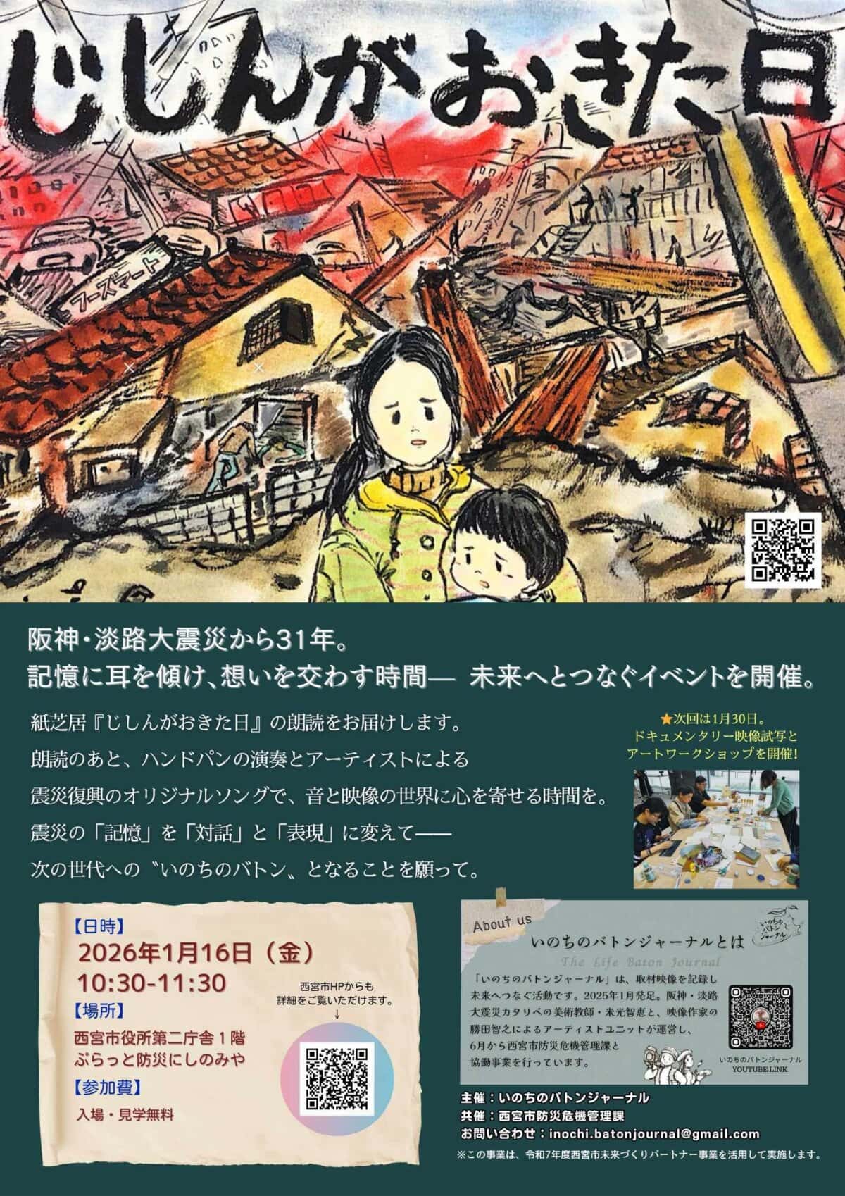 1月16日(金)、西宮市役所第二庁舎1階「ぷらっと防災にしのみや」で、紙芝居「じしんがおきた日」の朗読と、映像試写会が行われるようです。