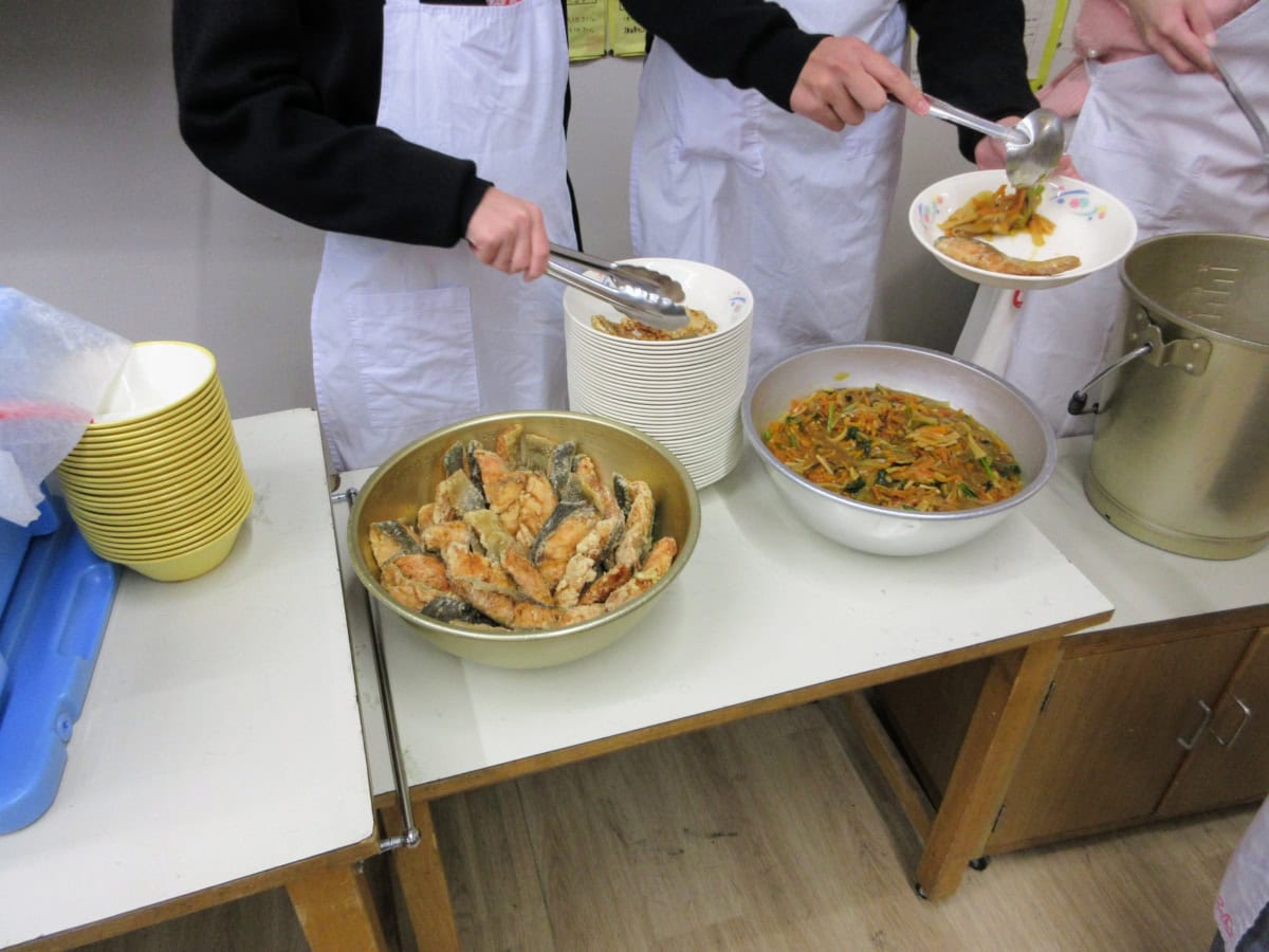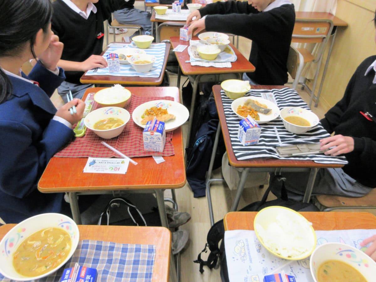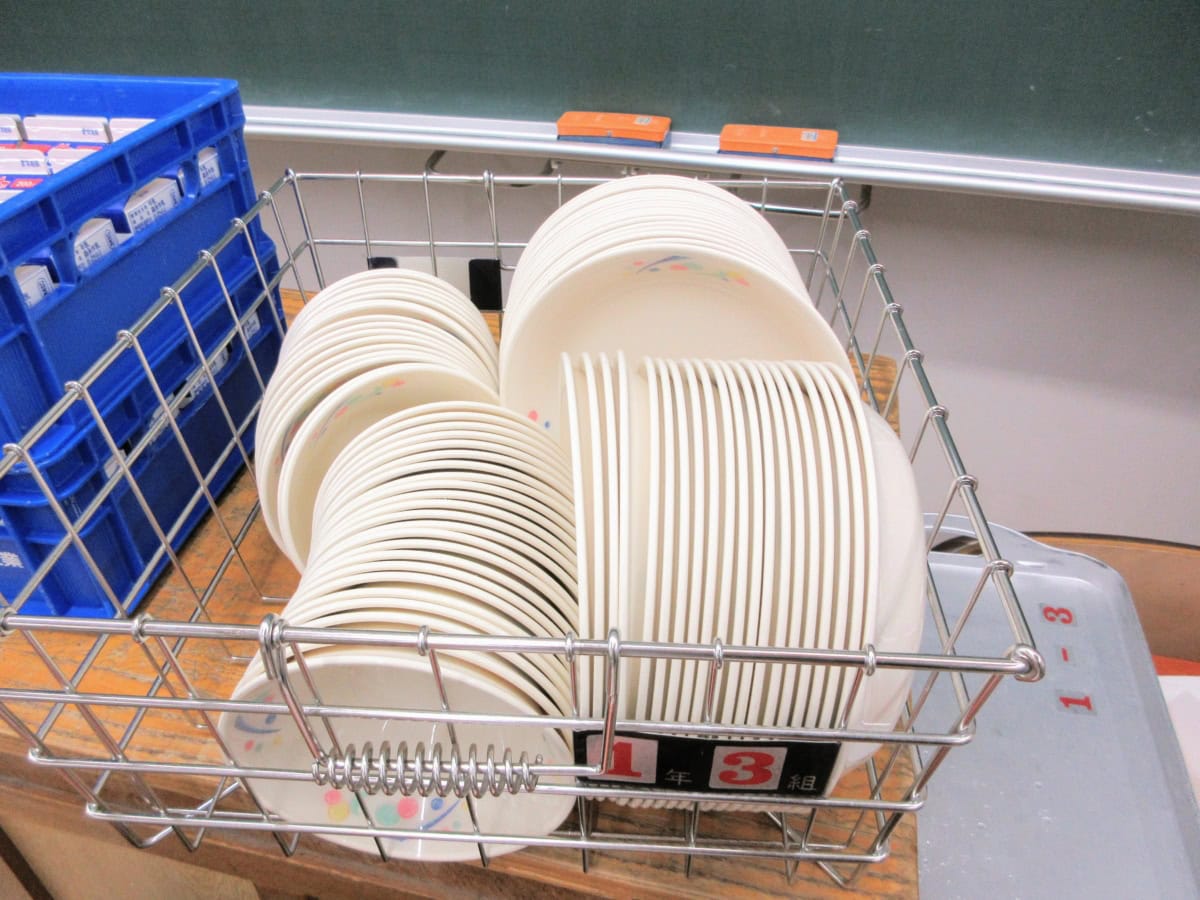 給食は今も班ごとにかたまって食べてまして、懐かしいあの雰囲気。なんかむかしは机ピッタリくっつけてた気がする