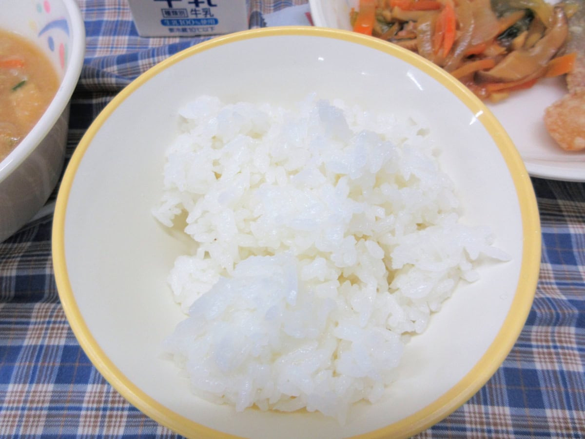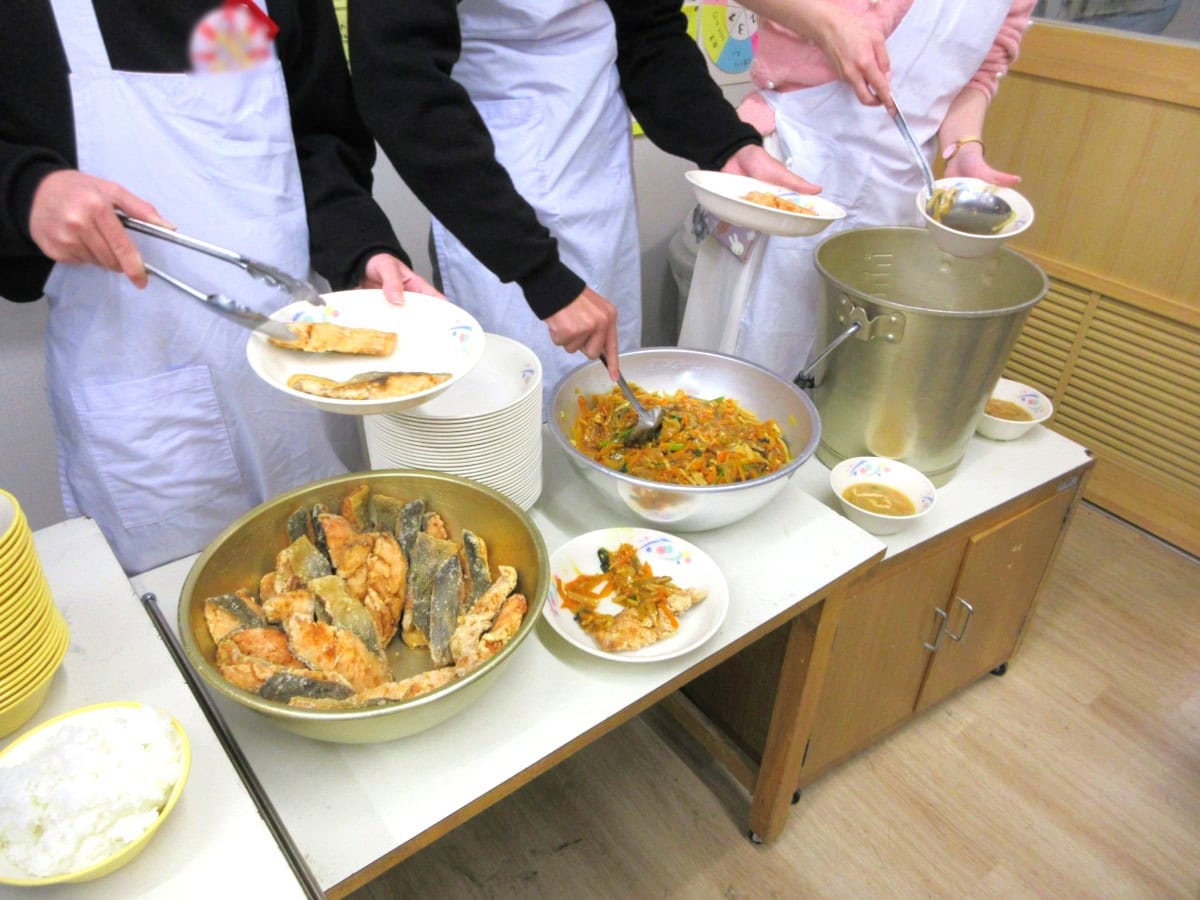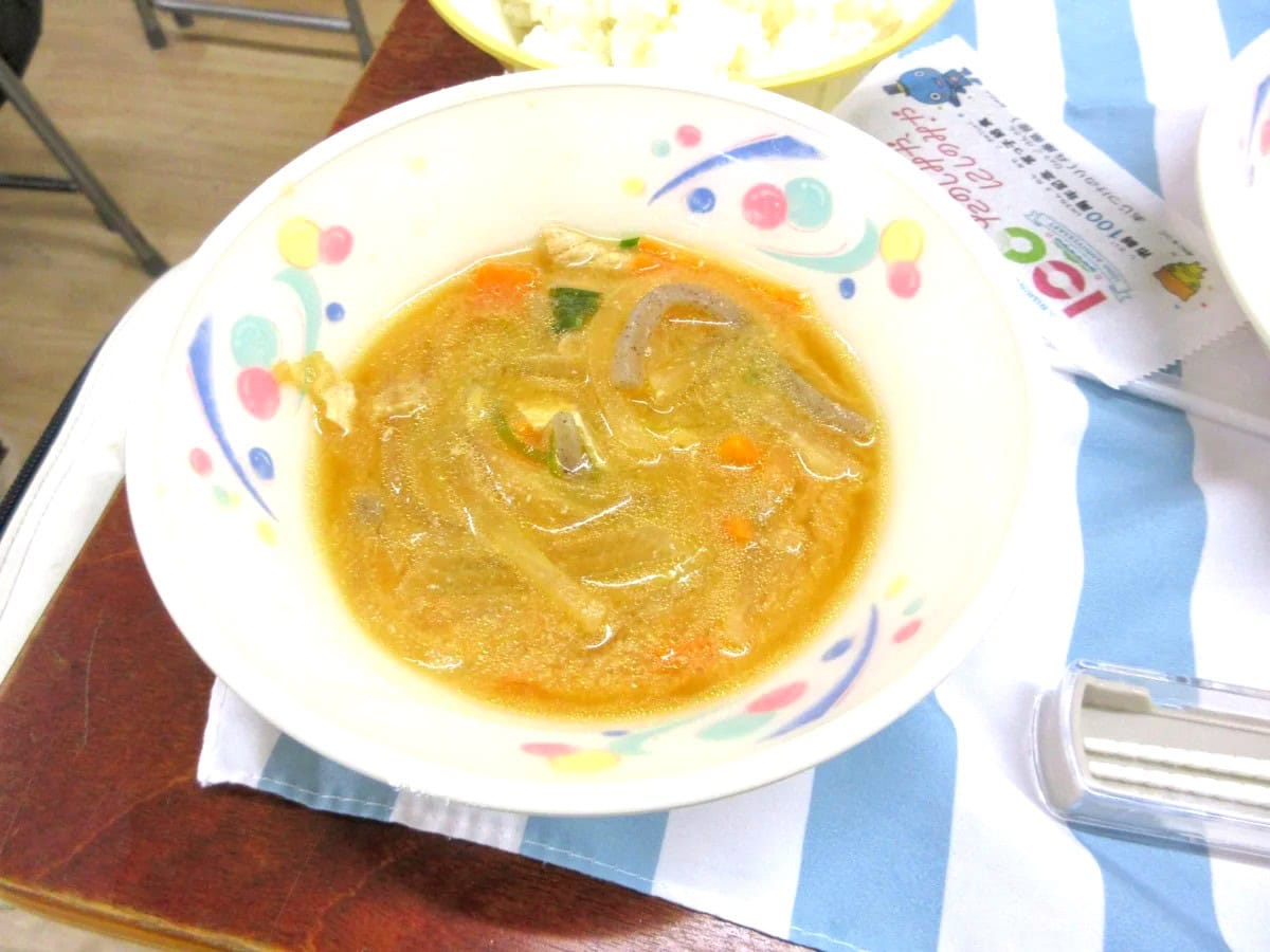 給食は今も班ごとにかたまって食べてまして、懐かしいあの雰囲気。なんかむかしは机ピッタリくっつけてた気がする