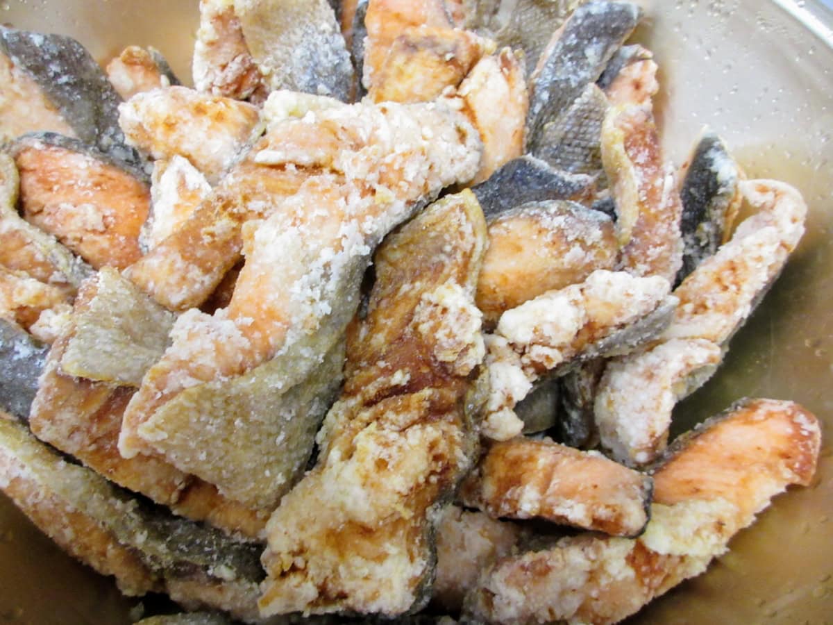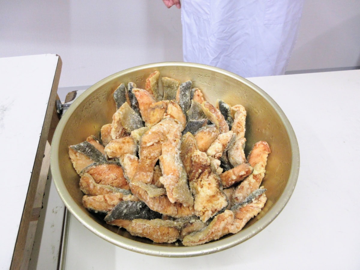 鮭のから揚げ。めっちゃおいしそ〜〜〜!なんか隠し味があるそうで