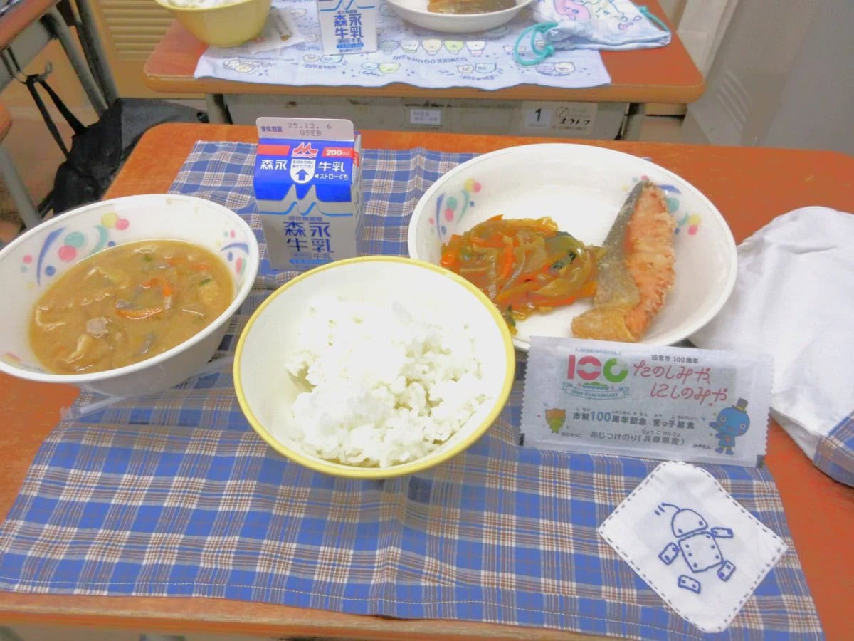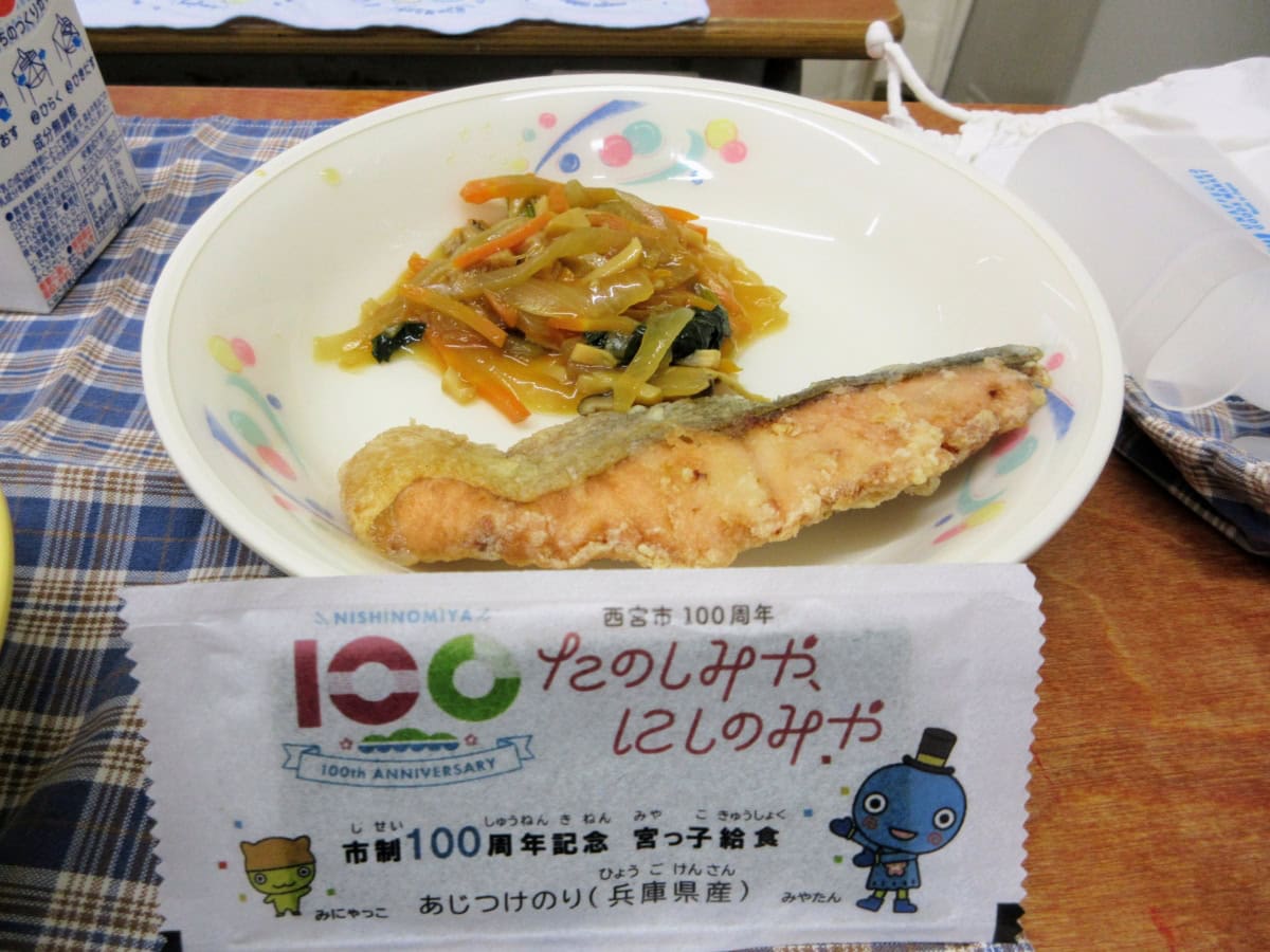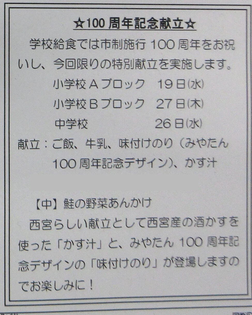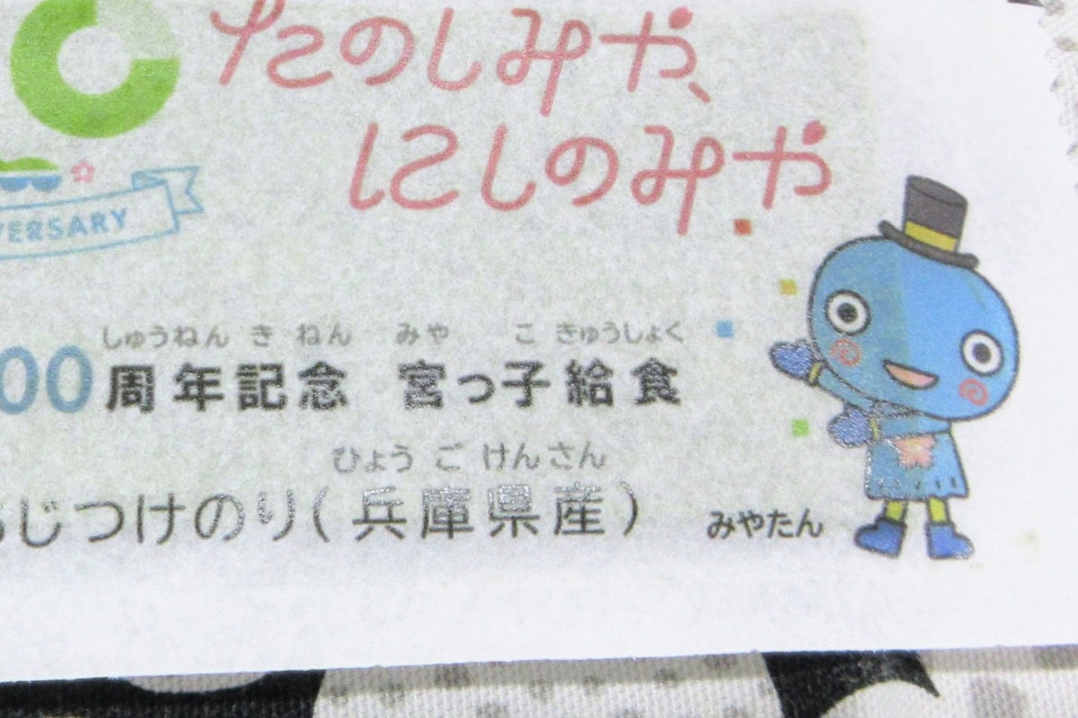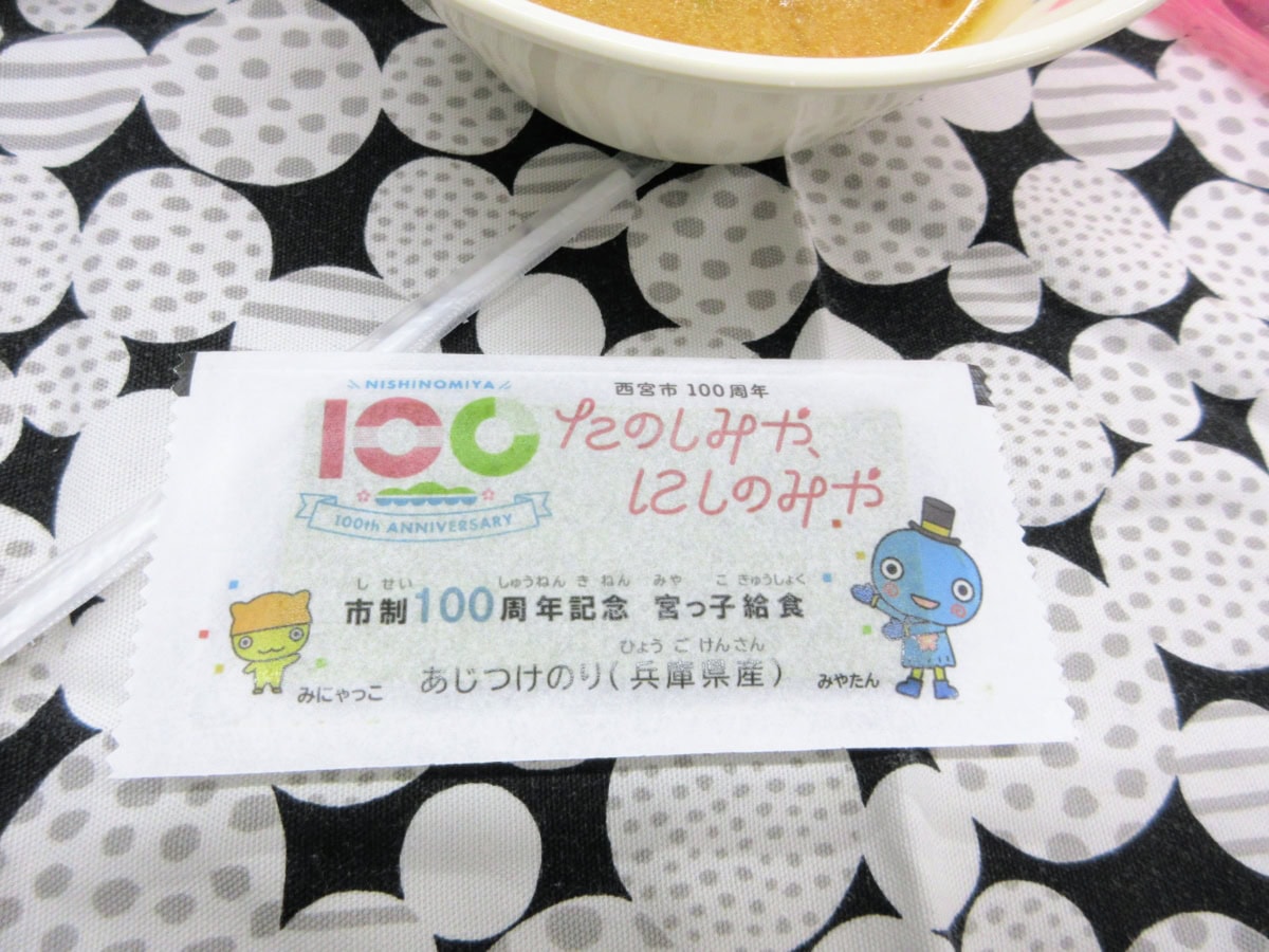 「宮っ子給食」って書いてる〜!今回は西宮市政100周年の記念メニューですもんね!!
