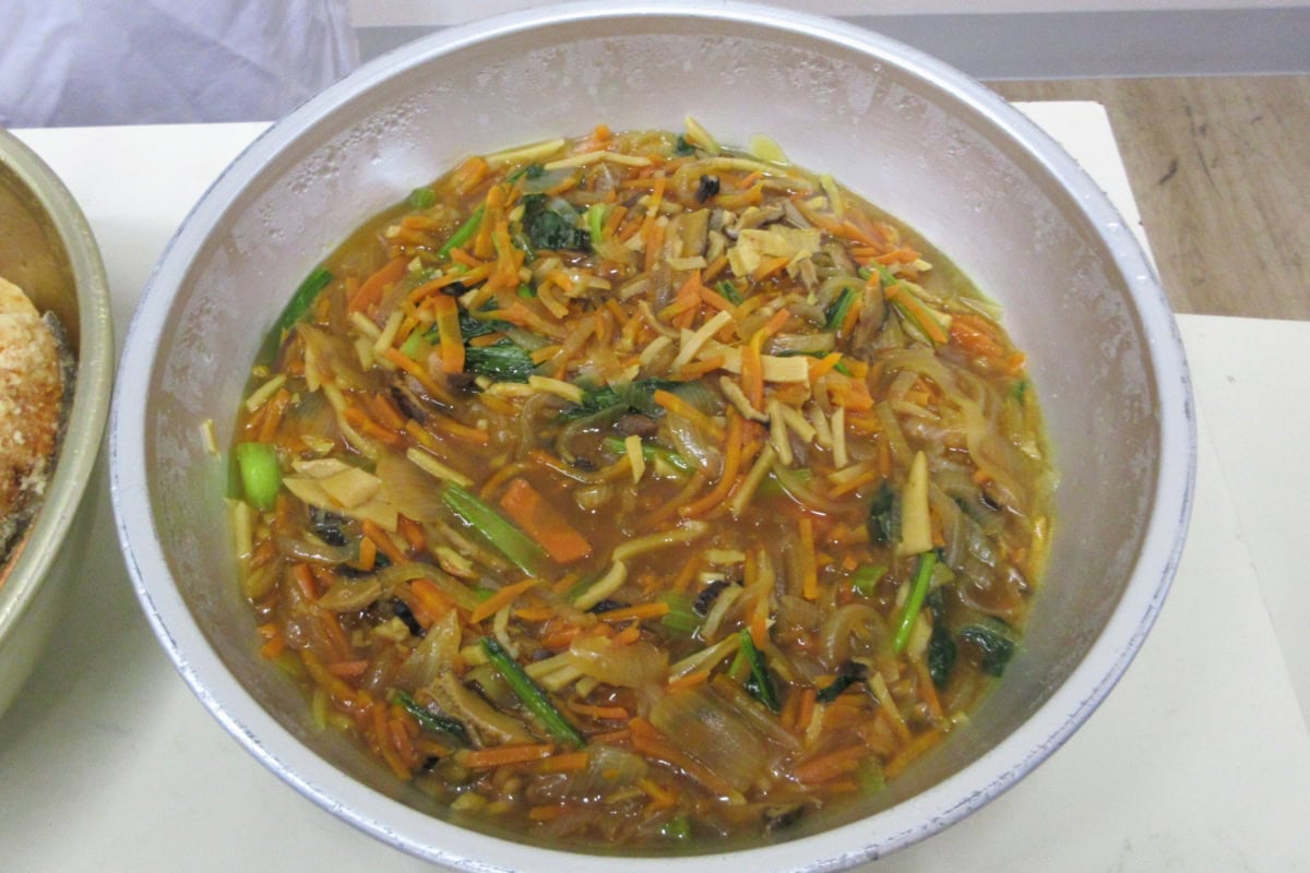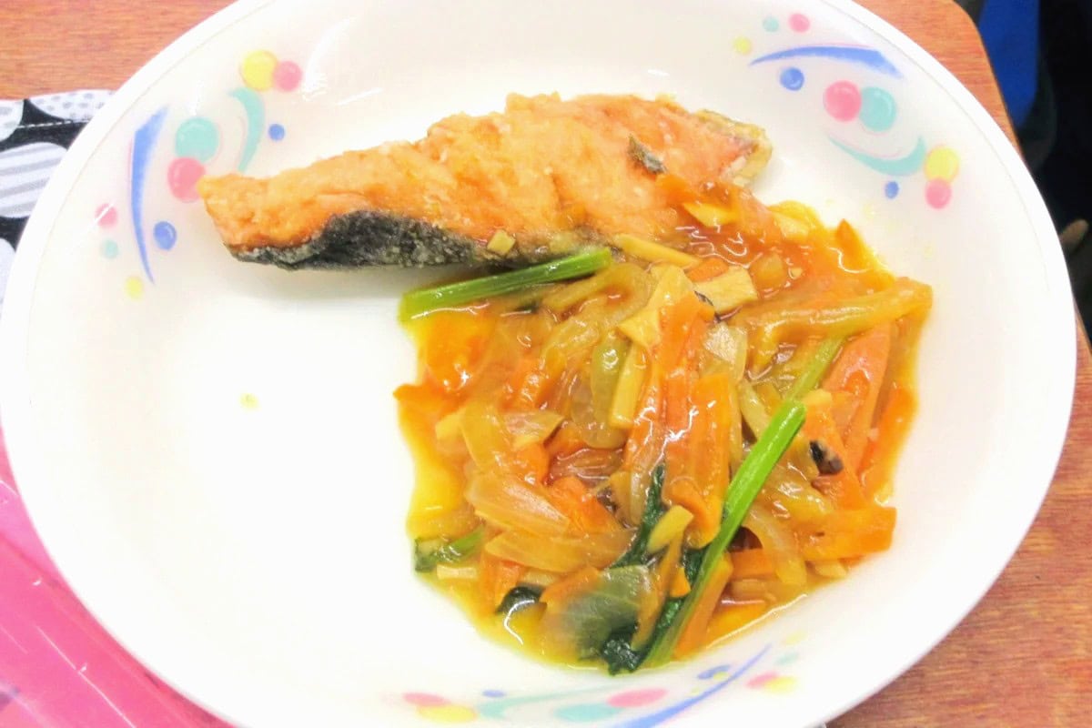 今日のメニューは「鮭の野菜あんかけ」。めっちゃ野菜いっぱい〜