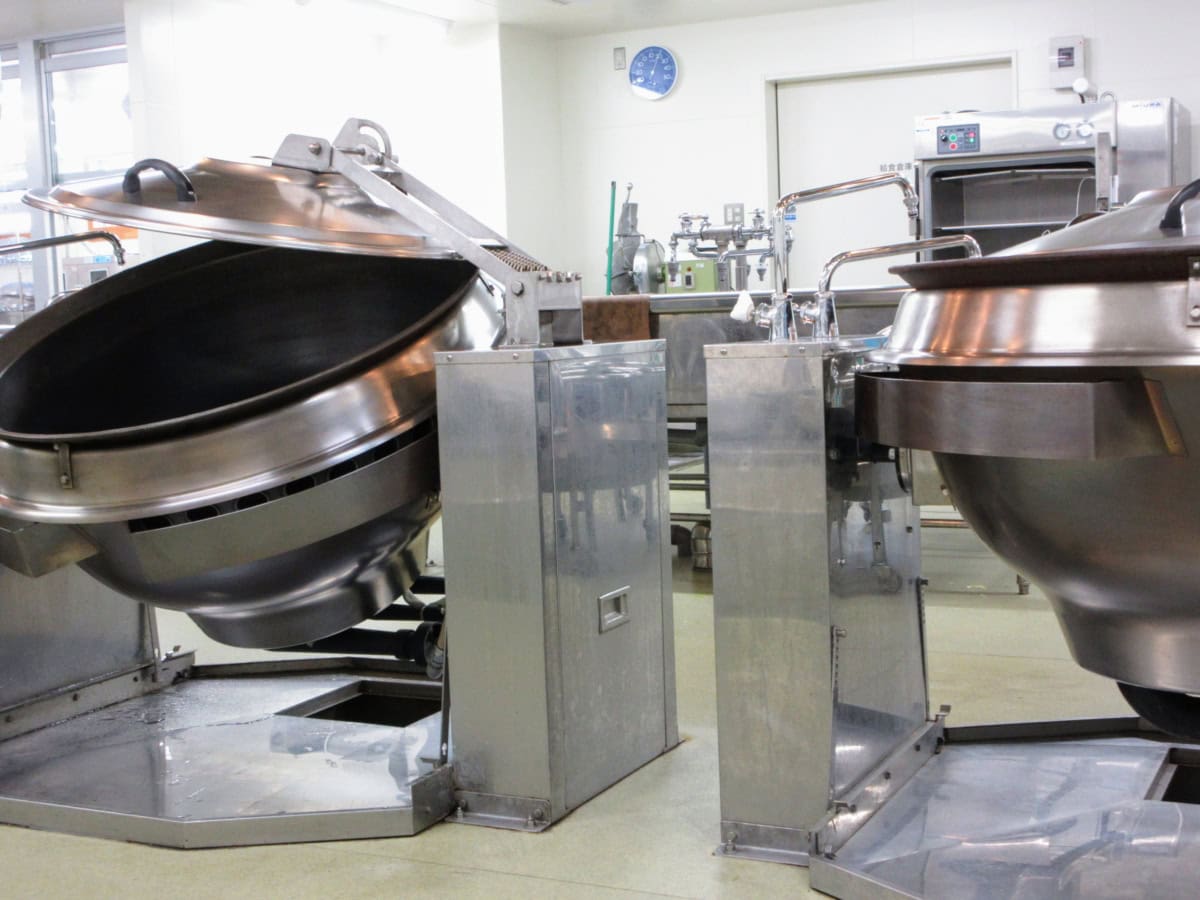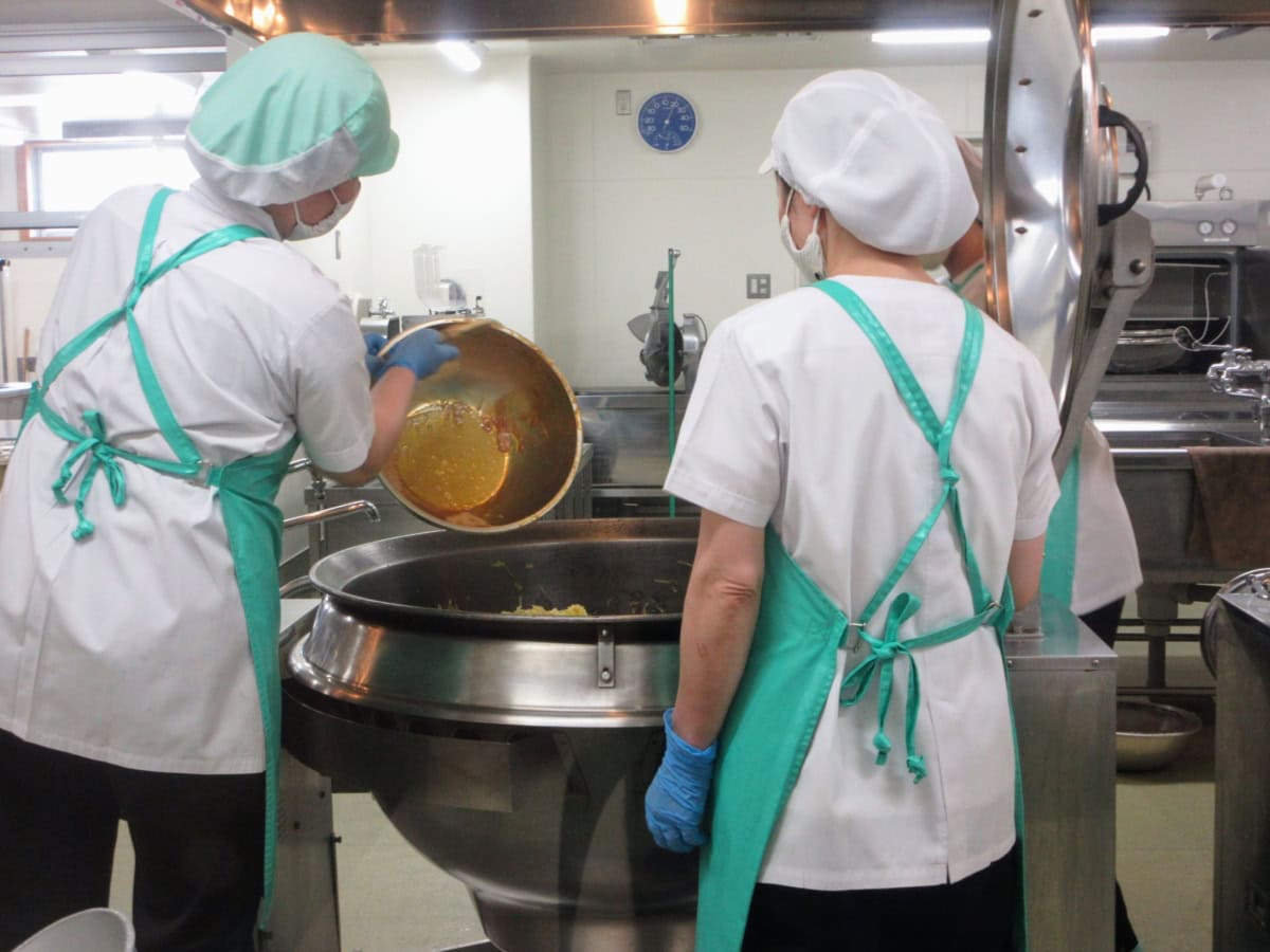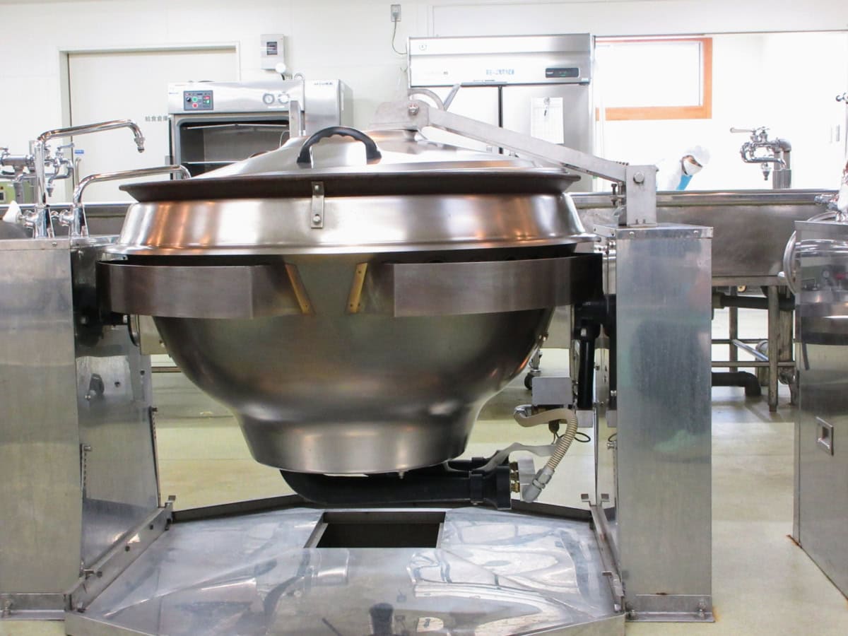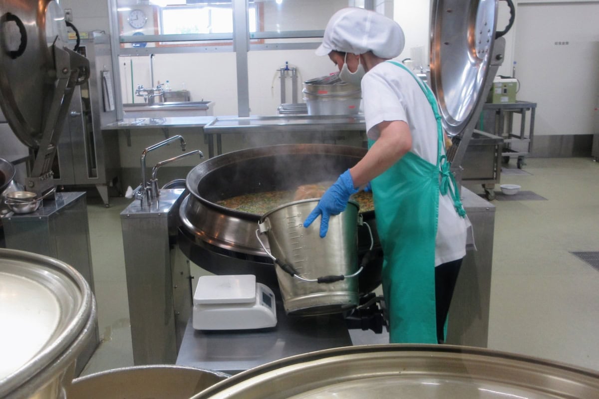職員さんが一生懸命に児童の給食を作ってます〜。にしても、この釜めちゃくちゃデカくない?