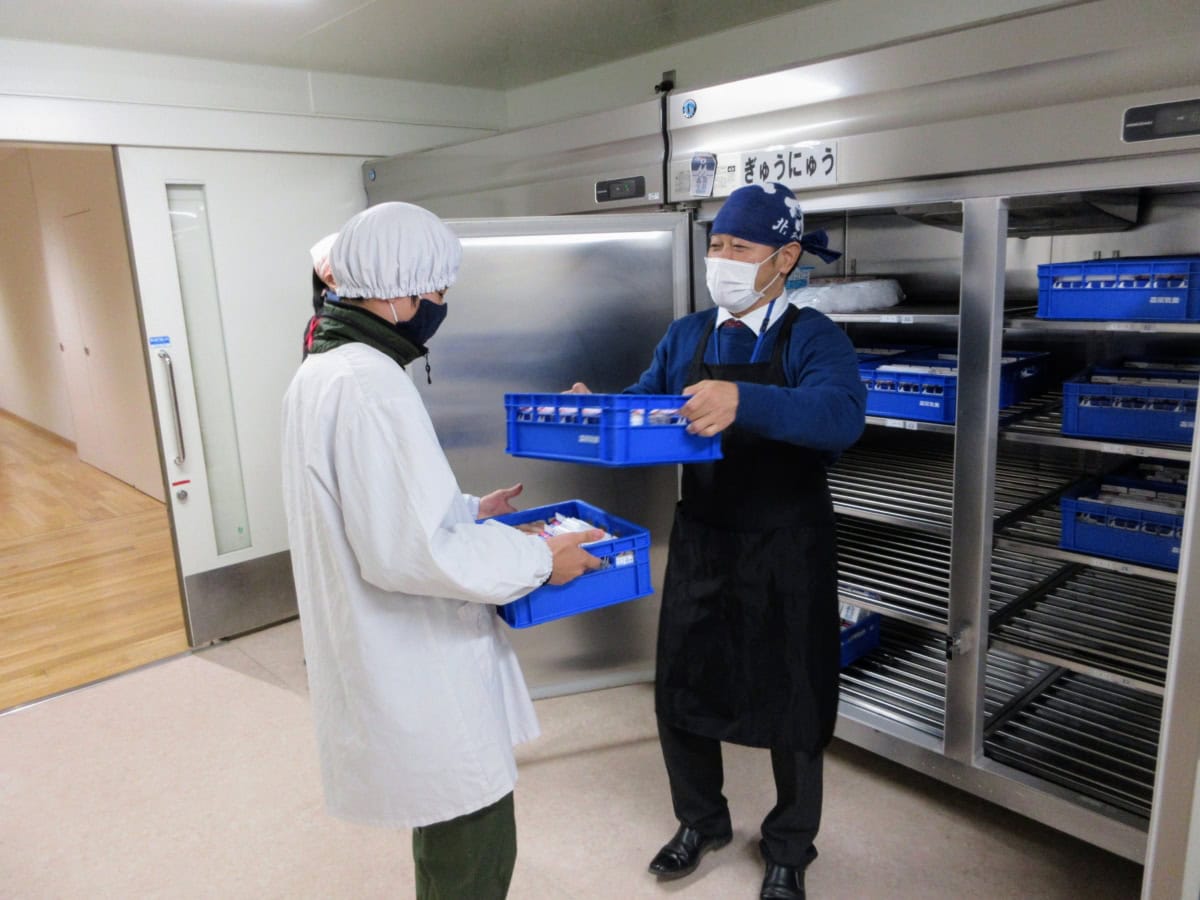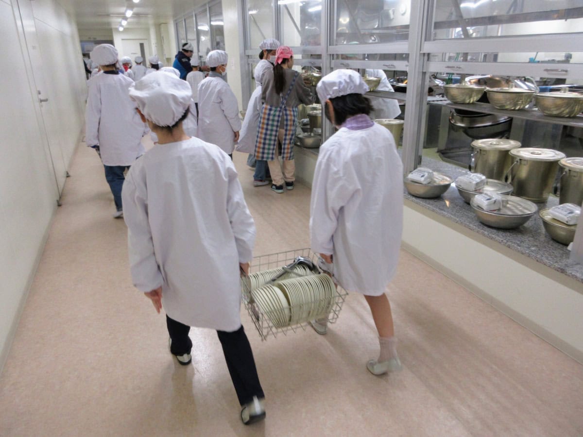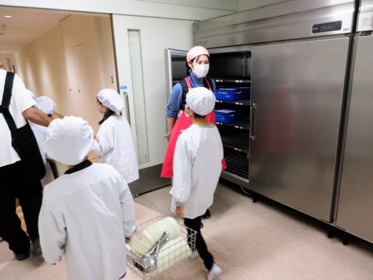 検食も終わり、お腹を空かせた、給食係の児童たちが給食室にやってきました。