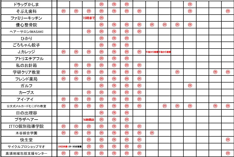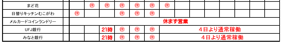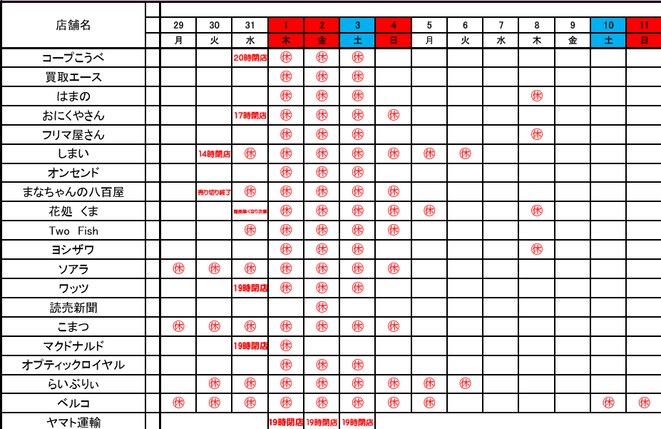 ダイエー、キャンドゥは年中無休。喫茶ベリー、コワクラ、ワールドプラスジムも短縮営業するようです。