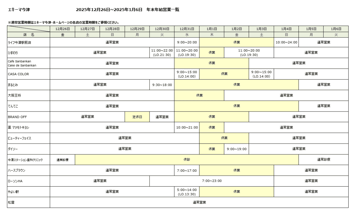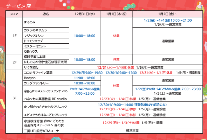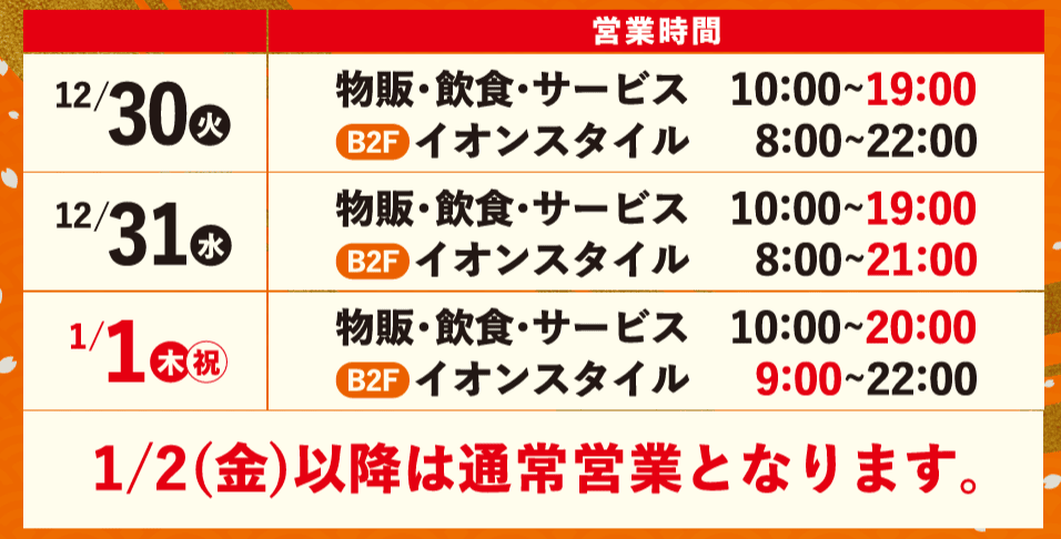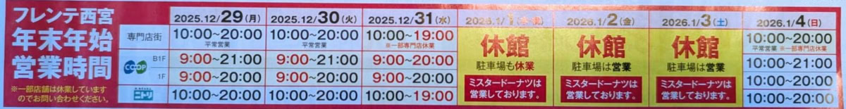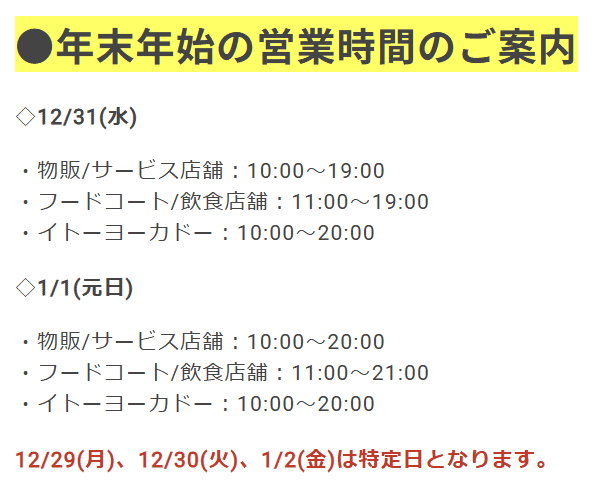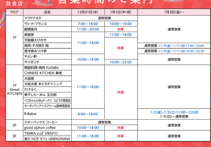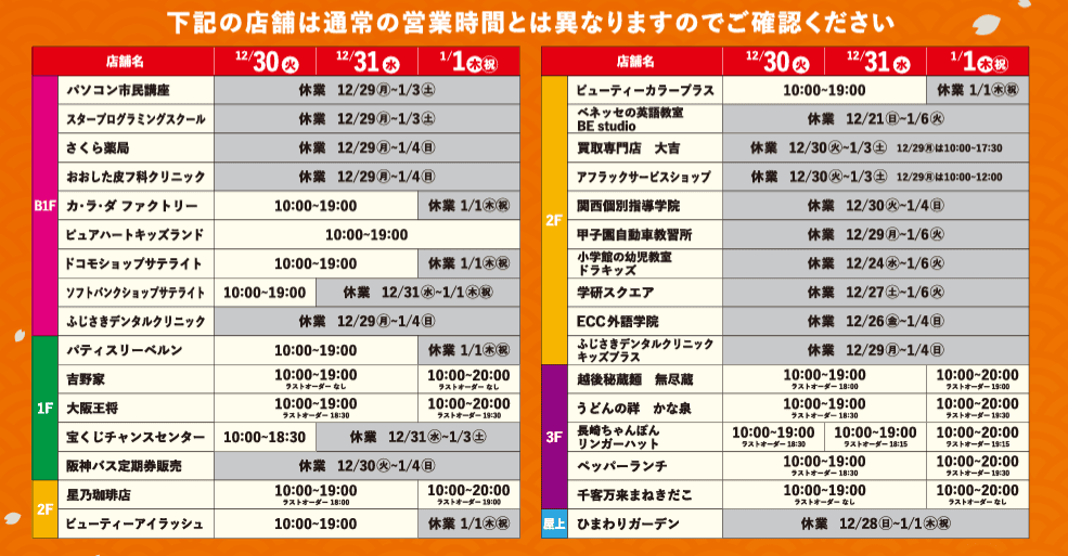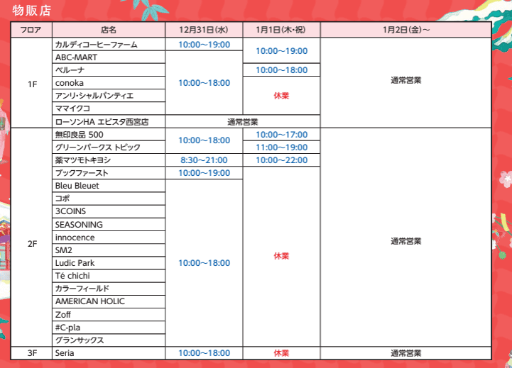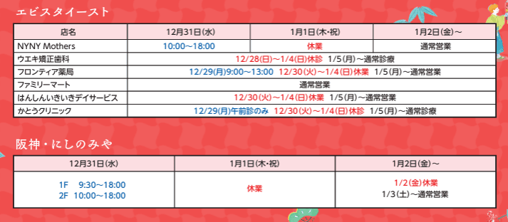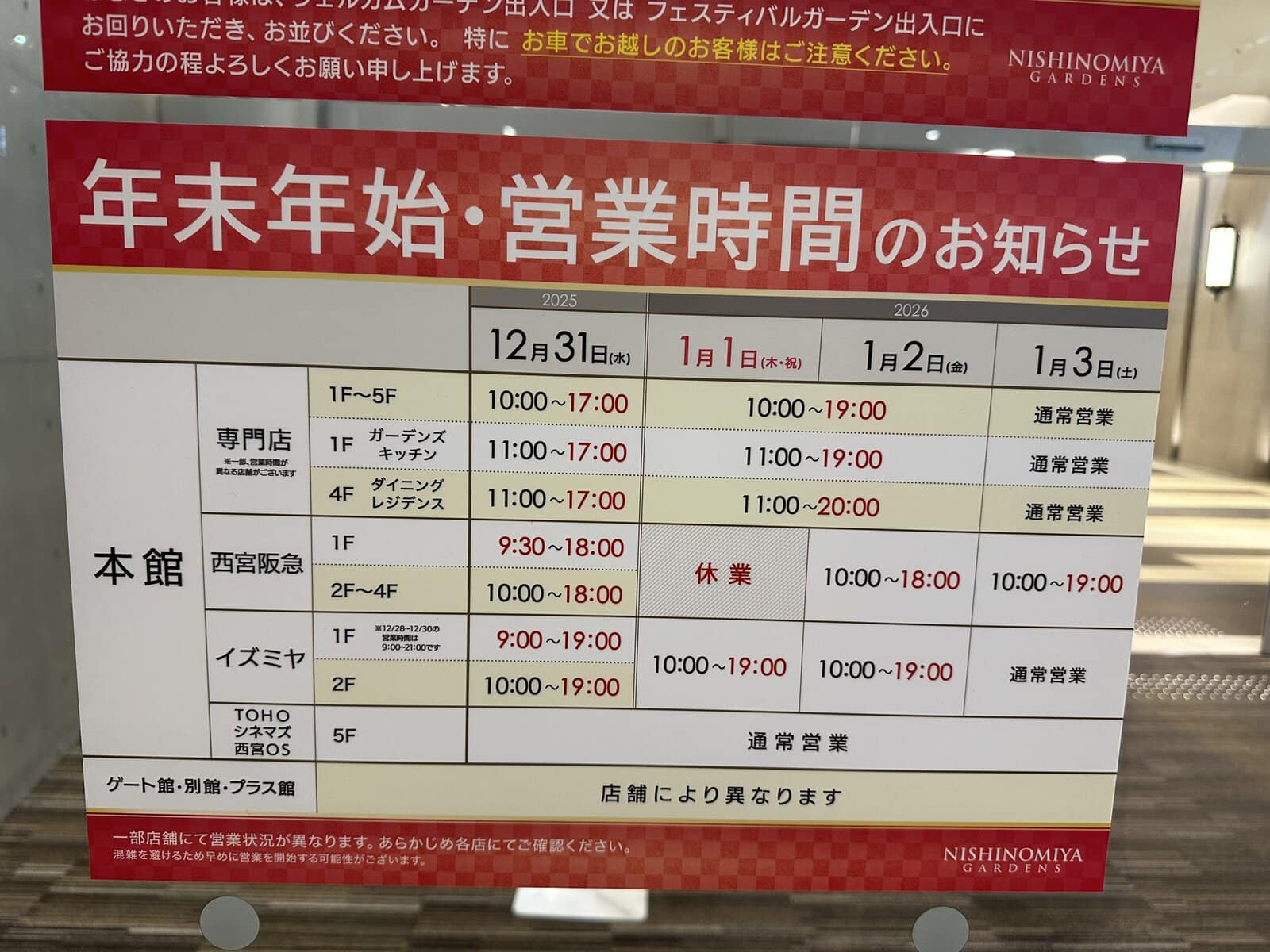 西宮市の主な商業施設の年末年始の営業時間をまとめました。