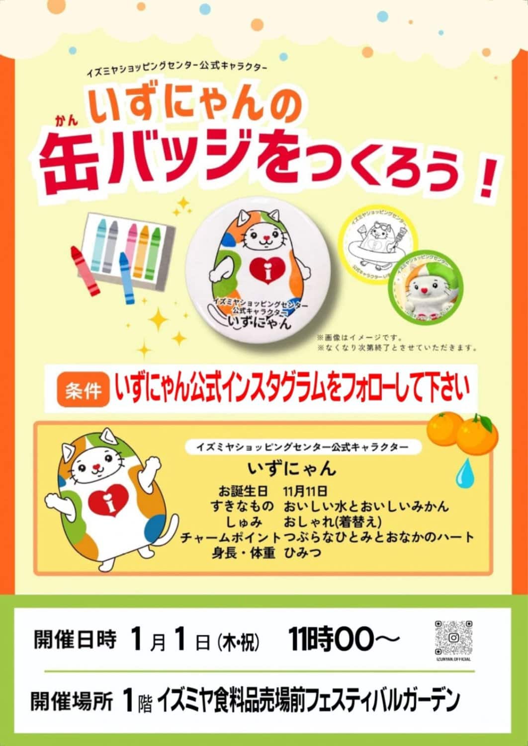 いずにゃんの缶バッジづくりができるようです。11時から。いずにゃん公式インスタグラムフォローで参加できます〜。※先着50名様限り