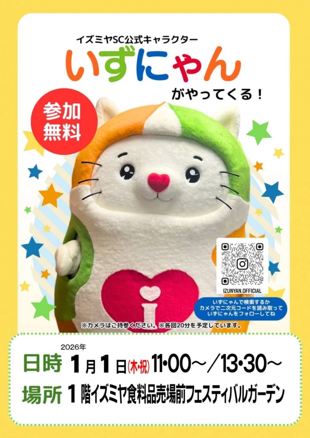 イズミヤショッピングセンターの公式キャラクターいずにゃんが、来年1月1日(木・祝)に、1階イズミヤ前の広場に登場するようです🙌