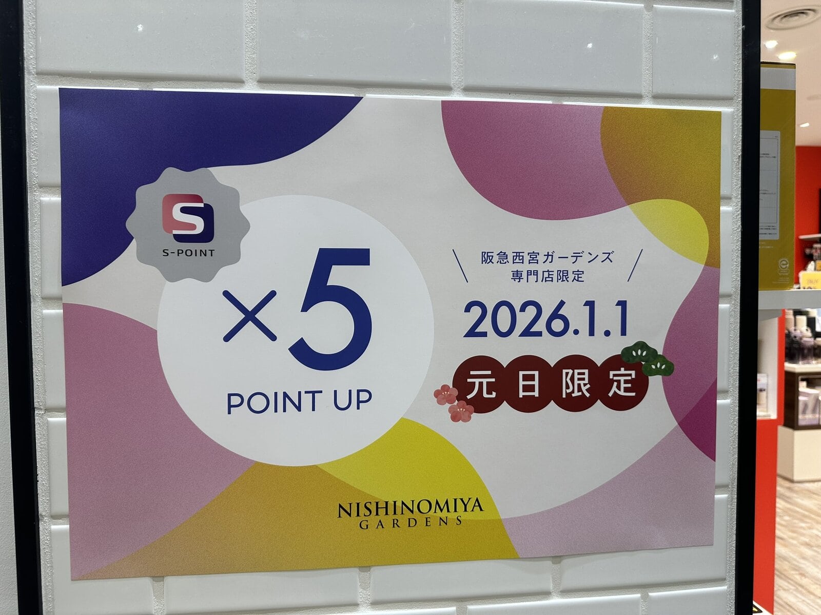 阪急西宮ガーデンズで1月1日に買い物をするとSポイントが5倍になるみたいです。