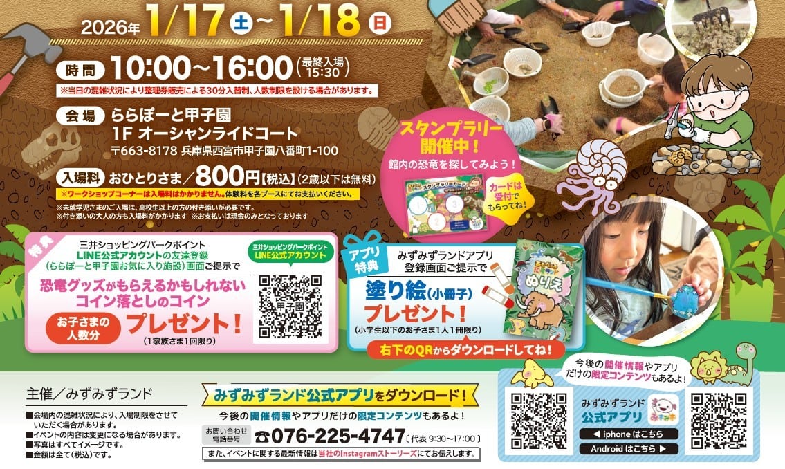 チラシを見ると、砂の中から化石をスコップで掘り出したり、筆を使ってペイント体験ができたり、スタンプラリーもあるみたい🦖