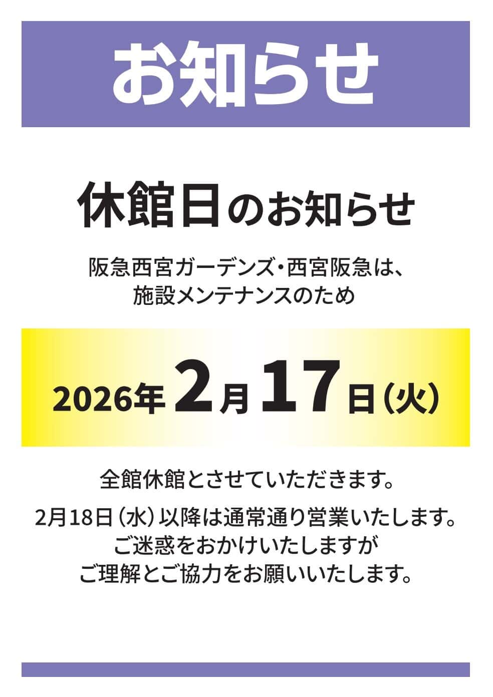 例年行われている阪急西宮ガーデンズの全館休業ですが、今年は2月17日(火)に行われるようです。