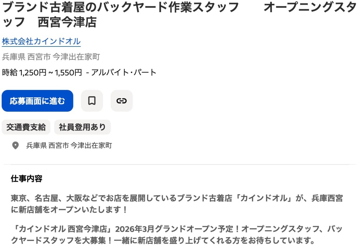 ブランド古着屋のバックヤード作業スタッフ オープニングスタッフ 西宮今津店 – 兵庫県 西宮市 今津出在家町 – Indeed.comより引用
