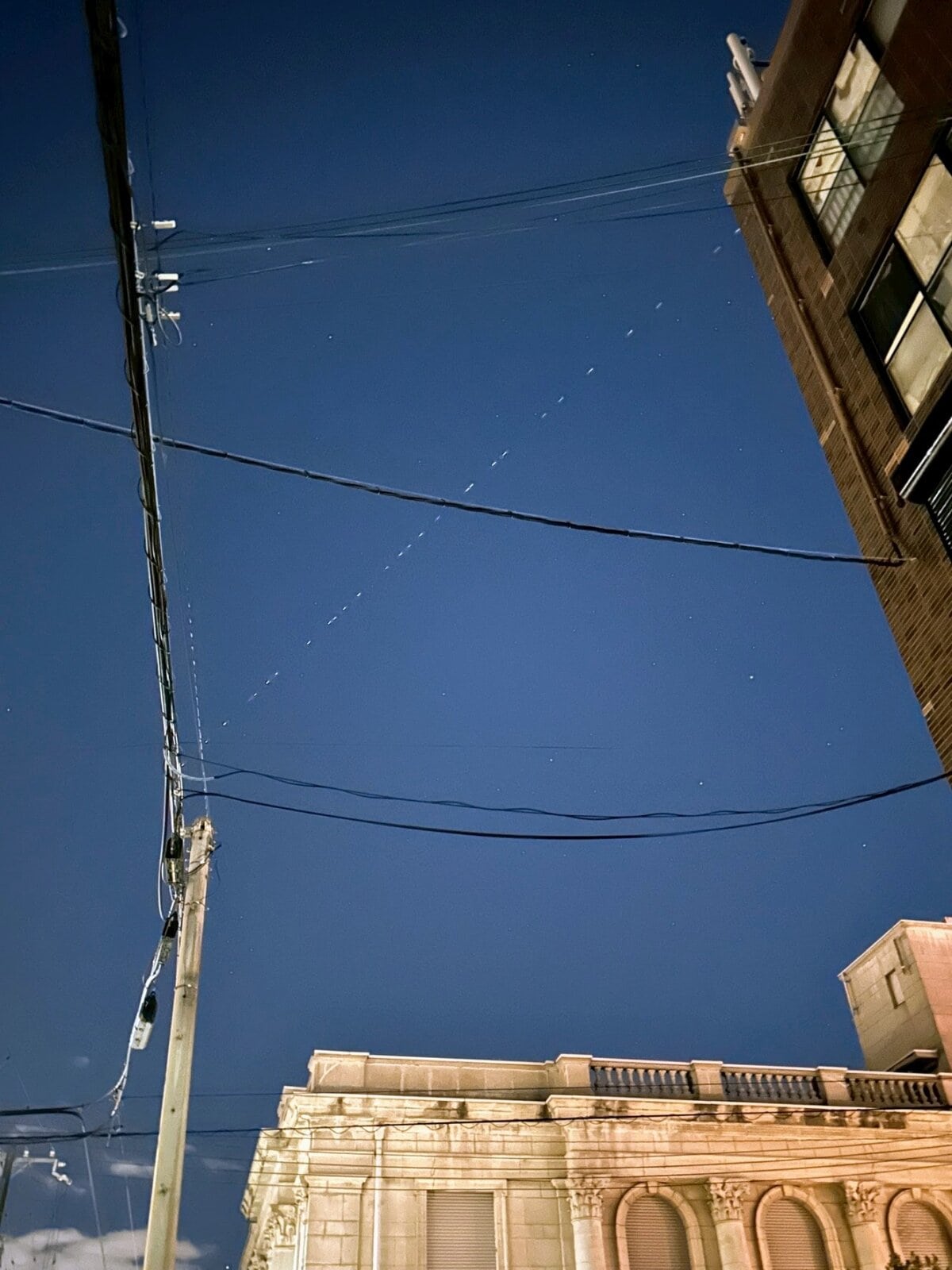 これ、銀河鉄道999現象とも言われてるらしく、スターリンクの衛星だそうです。イーロン・マスクのSpaceX社が提供する低軌道衛星です。ネット回線のやつ。