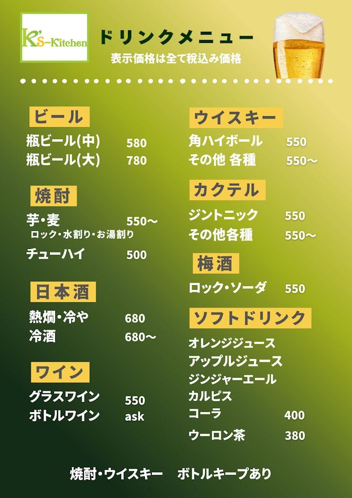 「K’s Kitchen」メニュー