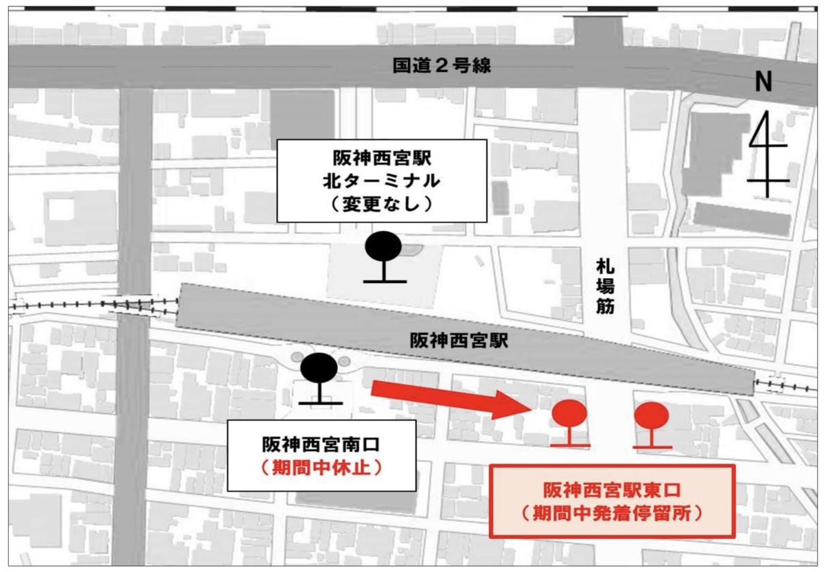 代替えのバス停は、阪神西宮駅東口(札場筋線のところ)となります。対象路線は「西宮浜手線」「マリナパーク線」