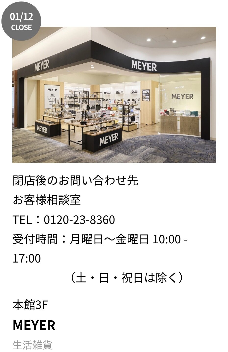 阪急西宮ガーデンズ本館3階のキッチン用品店「MEYER」が閉店しています。