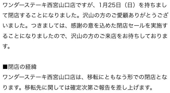 ちなみに1月16日(金)〜25日(月)までの10日間、閉店セールとして「とろけるハラミカットステーキセット」が1,000円でいただけるそうですよ。西宮の端っこにあるワンダーステーキ西宮山口店なので、移転先も西宮市内だとうれしいですね〜