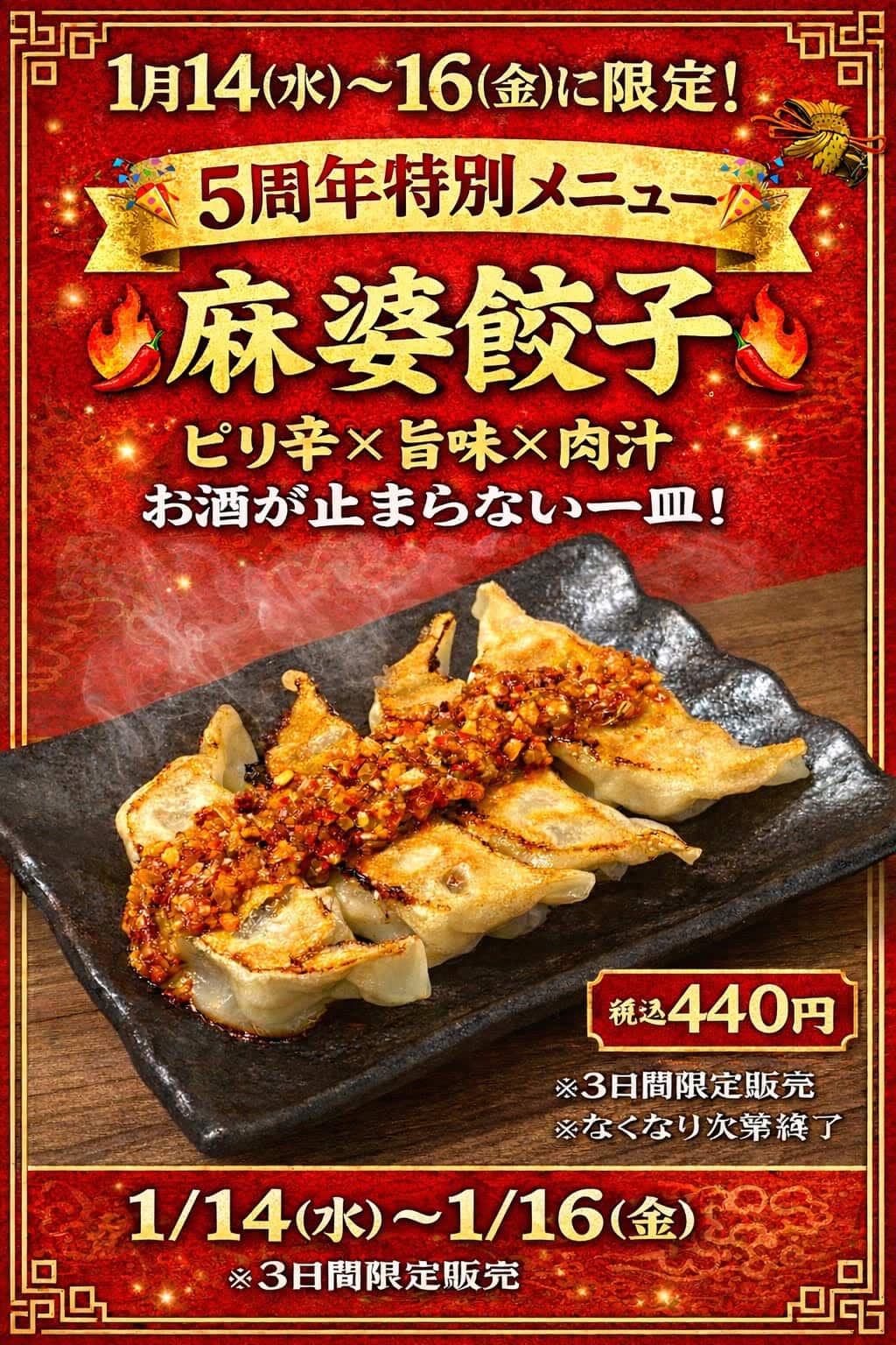 1/14(水)〜1/16(金)の3日間限定で、5周年特別メニュー「麻婆餃子」が登場しています。