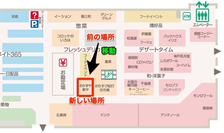 阪神にしのみや1階の、弁当・惣菜屋「おかずや煮平」の場所が移動しています。