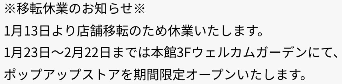 移転先はまだ発表されてませんが、現在ガーデンズ内にはいくつか空き区画があるので、そのどこかに入る感じになりそう。ポップアップストア2/22までの開催なので、新店舗のオープンはそれ以降になりそうですね。ダイアナをよく利用されている方にとっては、移転準備中もお買い物できるのはうれしいところですね。