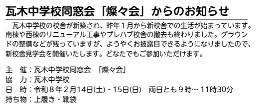 卒業生・地域の方限定で「瓦木中学校新校舎見学会」が開催されるようです。
