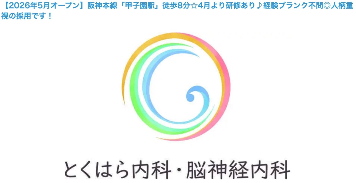 とくはら内科・脳神経内科(2026年5月オープン / 常勤)の医療事務求人・採用情報 | 兵庫県西宮市|コメディカルドットコムより引用