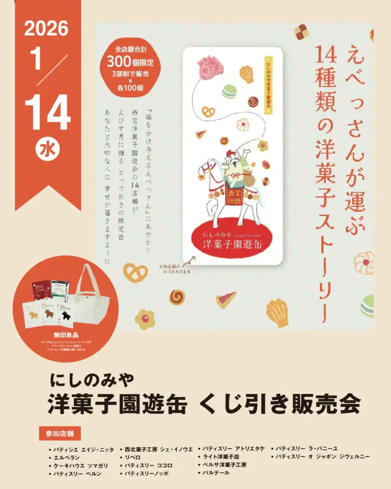 【阪急西宮ガーデンズ】2026にしのみや洋菓子園遊缶販売会 ~えべっさんが運ぶ 14種類の洋菓子ストーリー~| 無印良品 より引用
