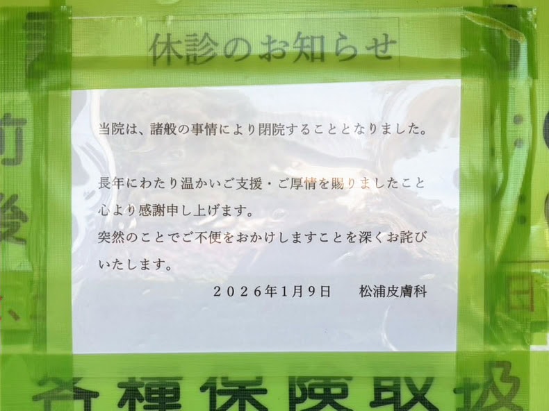 Googleの口コミによると、昨年8月ごろから休業されていたようです。ベテランの女医さんが診てくれる、地域に根付いた皮膚科で、かかりつけとして通われていた方にとっては、不便に感じられそうですね。