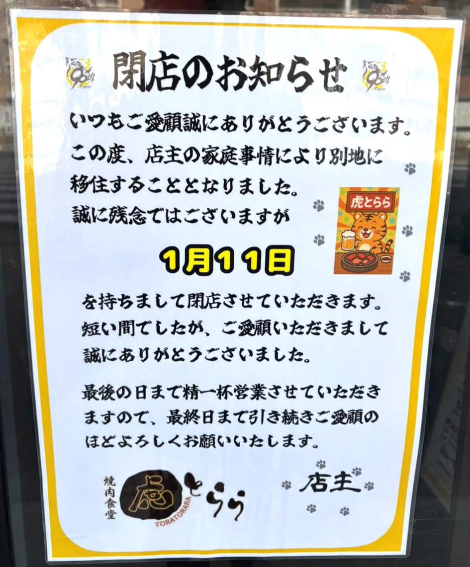 黒糖2号線ぞい上甲子園の焼肉専門店「焼肉食堂 虎とらら」が閉店しています。