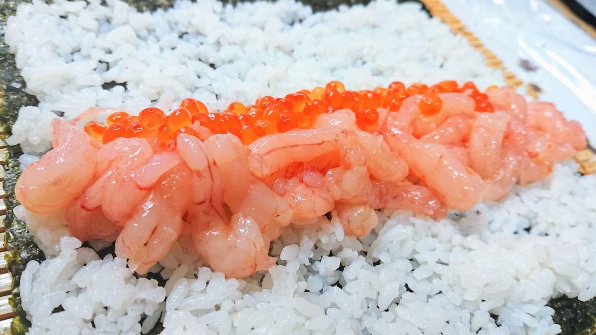 これもおいしそ〜〜!甘海老昆布締めといくら醤油漬けのコンビ。いくら細巻きは1,922円税込 要予約で販売。