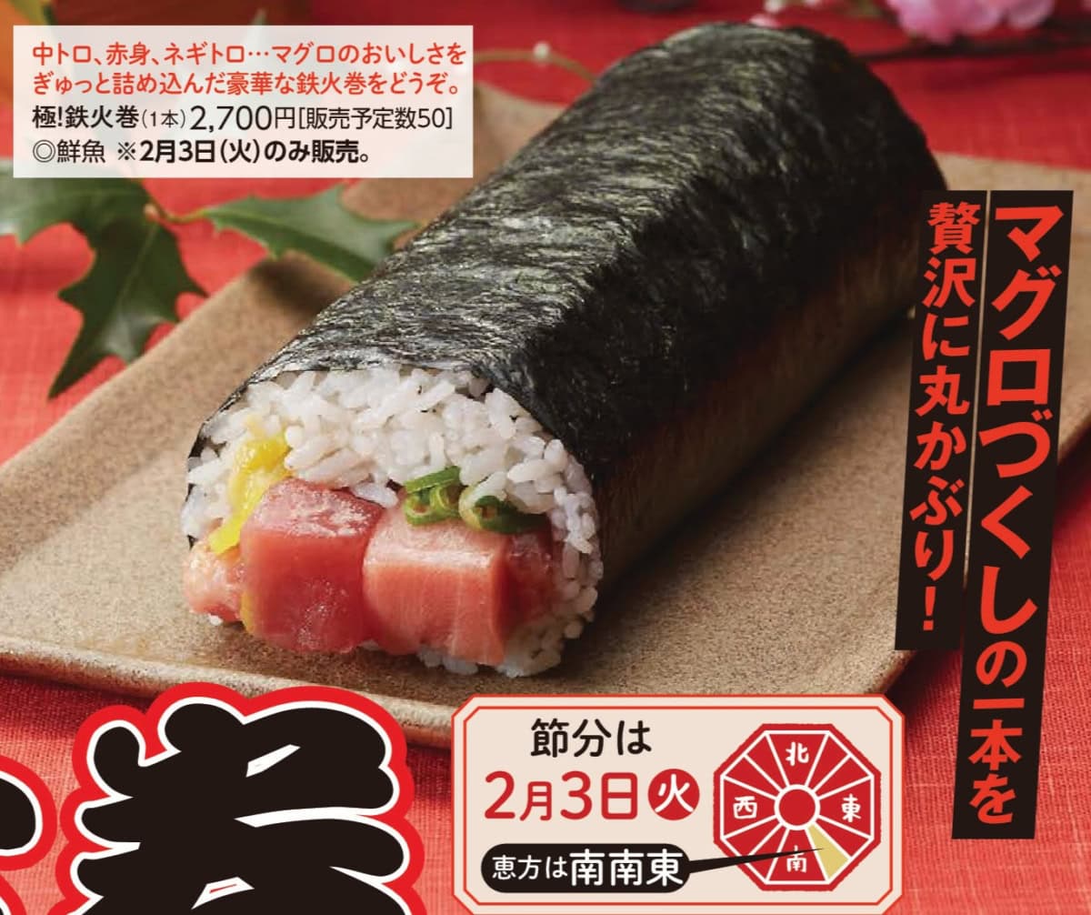 恵方巻きは2月2日(月)・3日(火)です。3日のみも多いのでチラシをよ〜く確認して買いにいってくださいね!